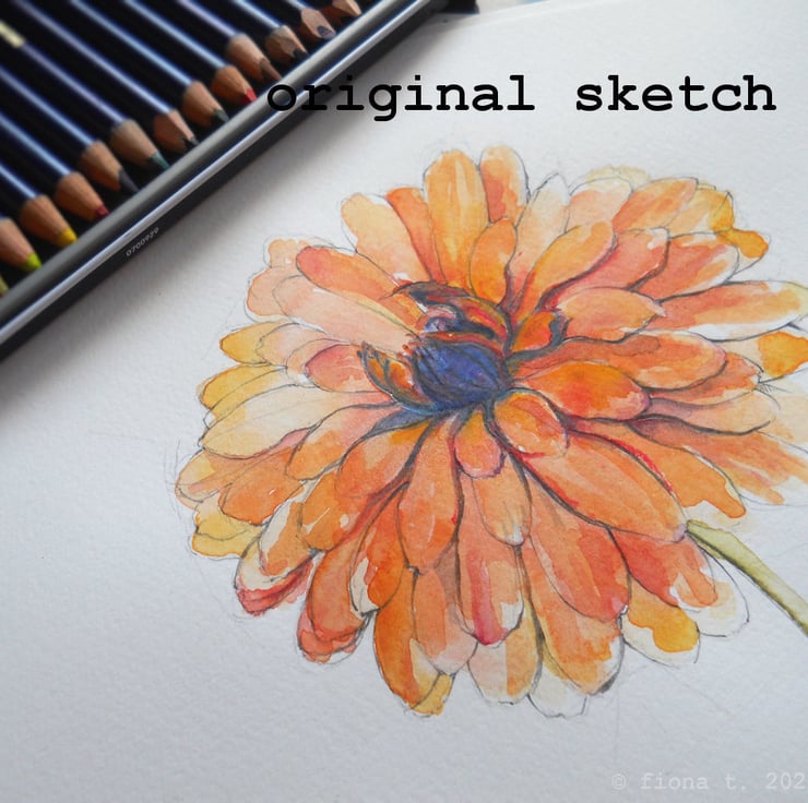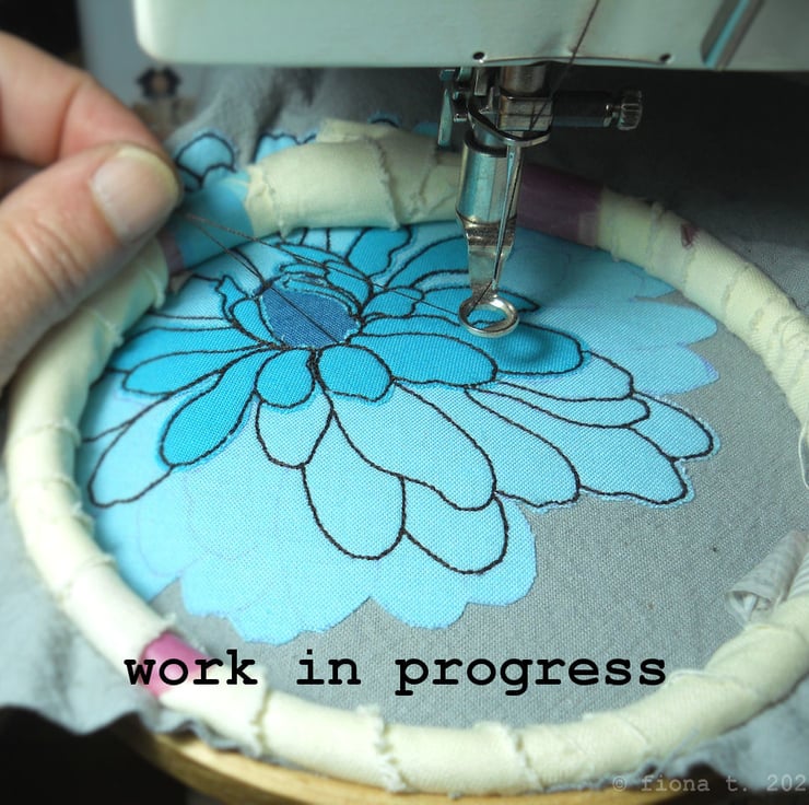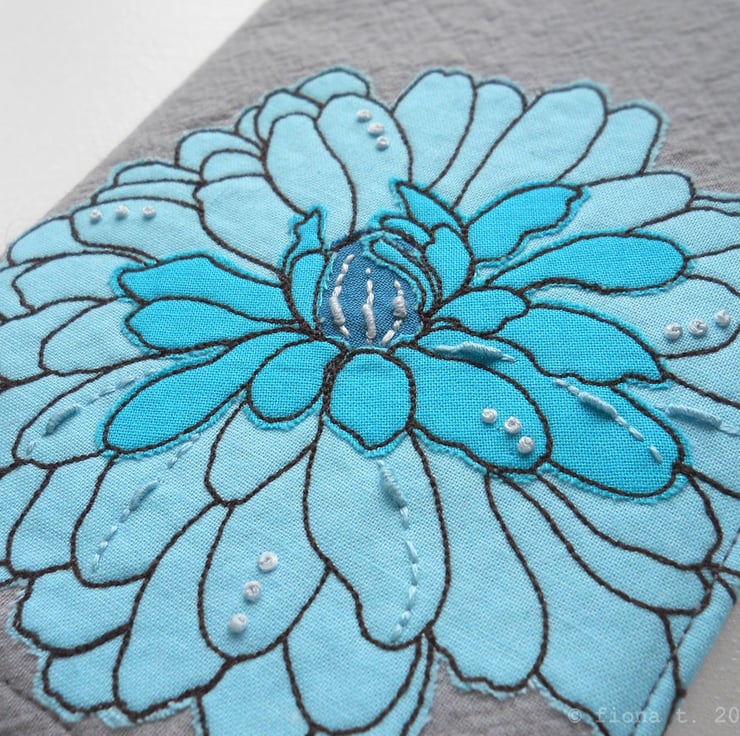 translated from my original pencil sketch, this flower is free hand embroidered in teal and turquoise blue cottons on to hand dyed grey cotton calico.