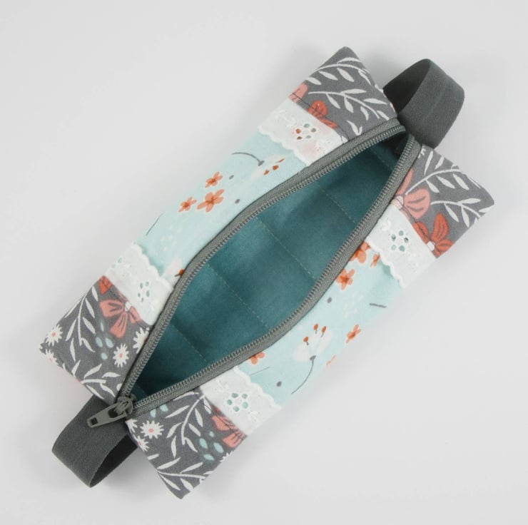 Lightly padded lining to protect both the journal cover and the pens & pencils. All cotton fabrics. Soft lingerie elastic and a YKK zipper.