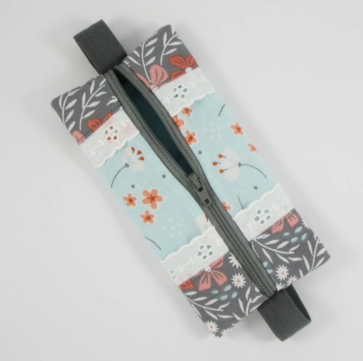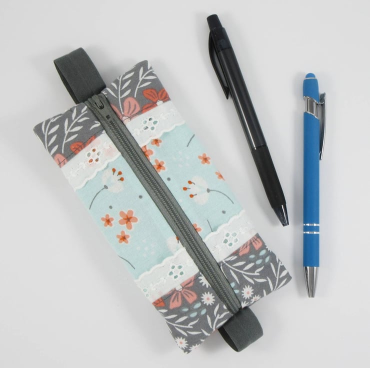 A neat little pouch ideal for fitting around an A5 size diary, journal or planner. The zipper pouch fixes around the book with an elastic strap which can be used to mark a page or keep the book closed.