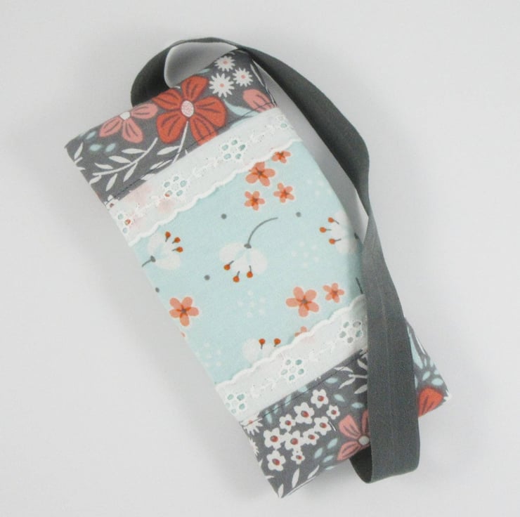 Coordinating fabrics in grey, aqua and peach-orange with a broderie anglaise trim.