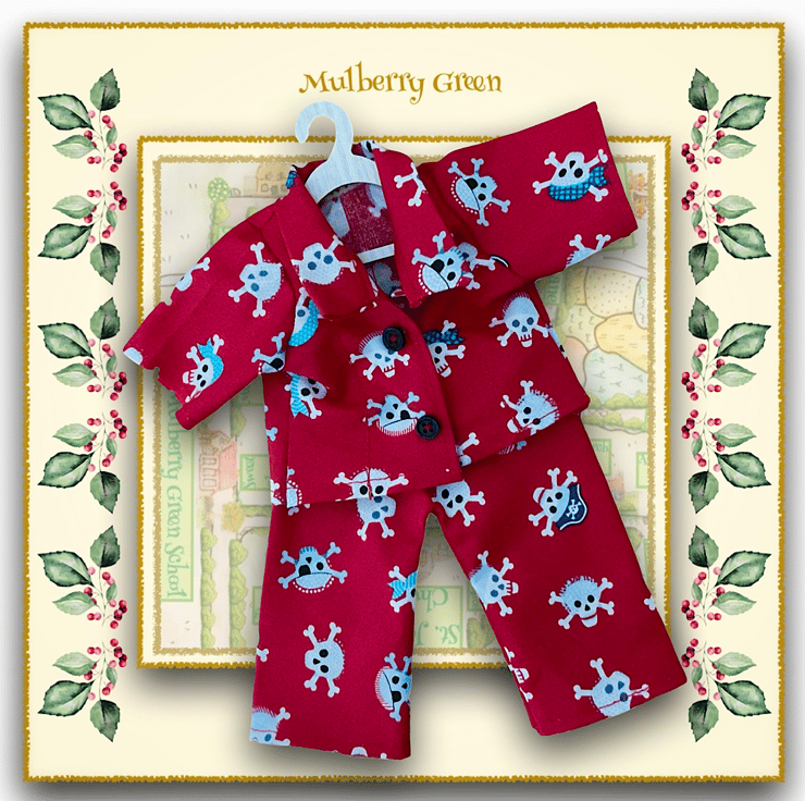 Cute little pyjamas in a pirates print, to fit the Mulberry Green characters. The pyjamas are made from best quality cotton and fasten at the front with two little poppers underneath the buttons.