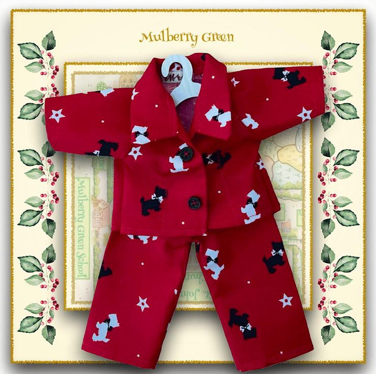 Cute little pyjamas in a scottie dog print, to fit the Mulberry Green characters. The pyjamas are made from best quality cotton and fasten at the front with two little poppers underneath the buttons.