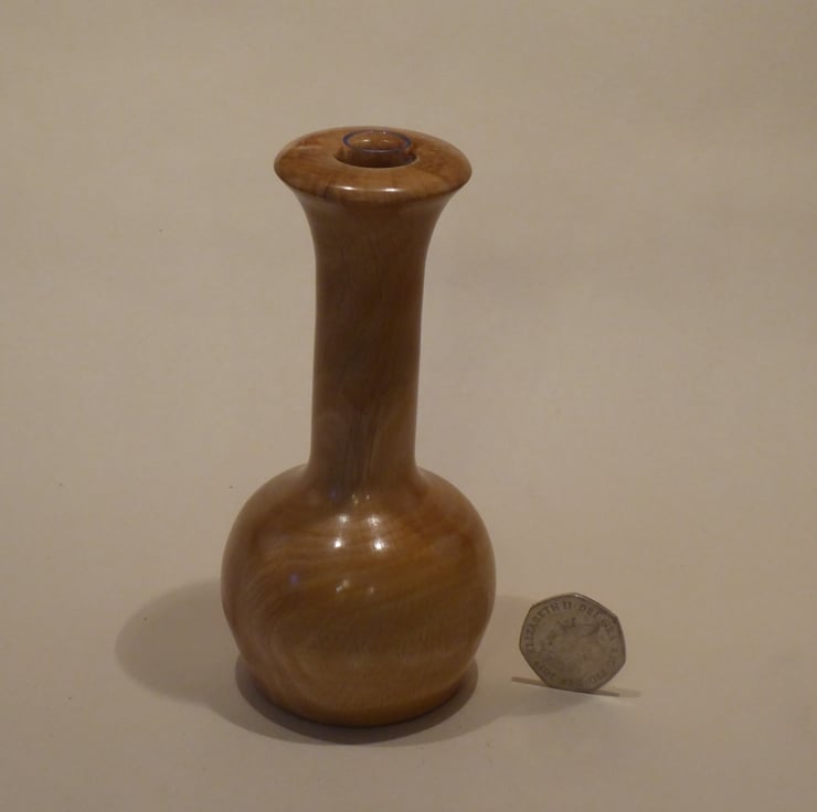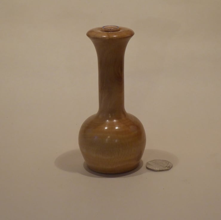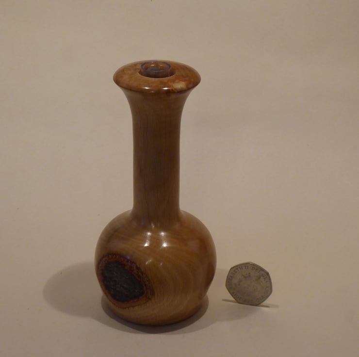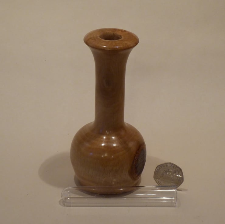 A Bud Vase or Twig Vase made from a branch of Copper Beech from my garden. A section of bark has been left on the wood whichgives it some interest. There is a plastic test-tube inserted (Removable) So that a live bud or flower can be kept watered,