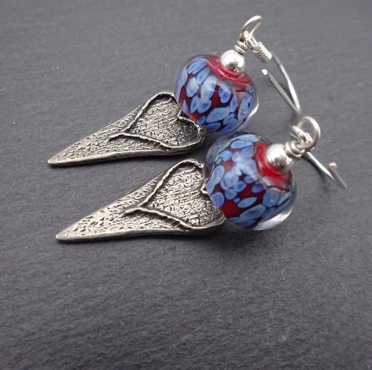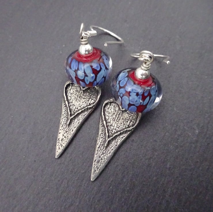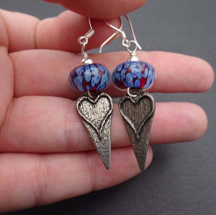 A pair of earrings made with sterling silver ear wires, handmade lampwork glass beads and handmade pewter heart drops.