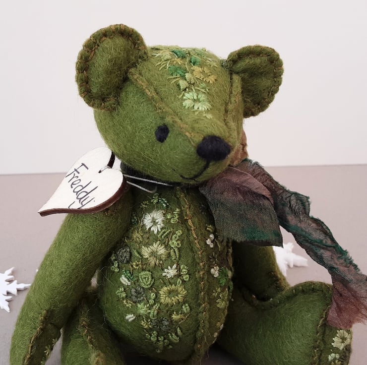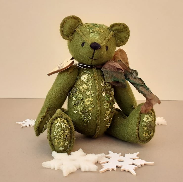 Freddy was created from quality wool felt in meadow green, a rich Christmas green, he has hand embroidered flowers to his body fronts, foot pads and head centre in greens to compliment and match his fabric.