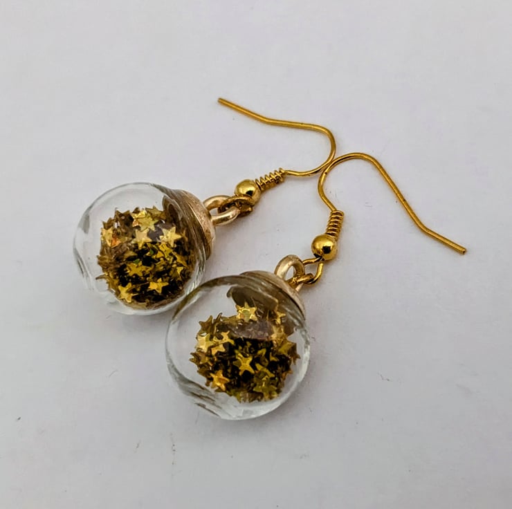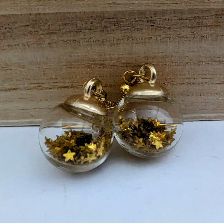 15mm glass Christmas baubles on hypo allergenic gold plated hooks. In an organza gift bag.