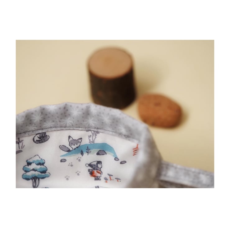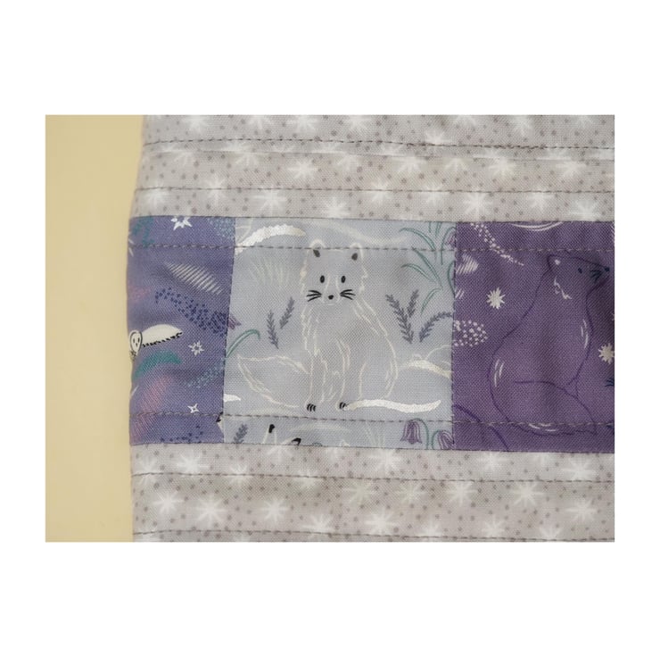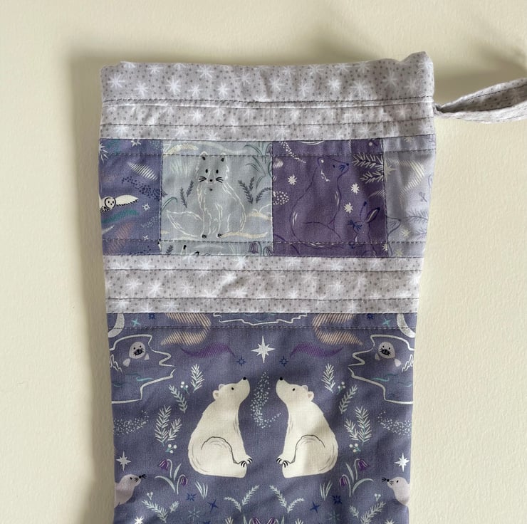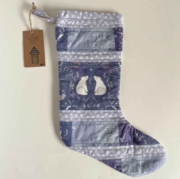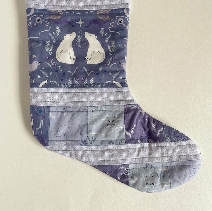 Cute Christmas stocking with an artic adventure design. Quilted and lined inside.