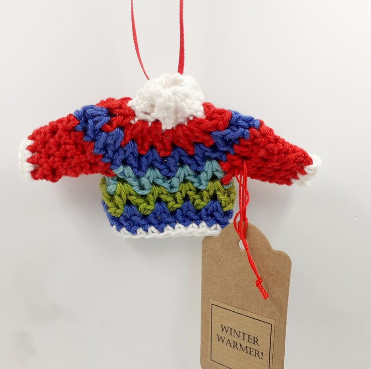 This mini festive pullover decoration is crocheted in cotton from a pattern adapted from one by raffamusadesigns.com . It has a narrow ribbon hanging loop and a tag which reads, Winter Warmer, although I am very happy to exchange this tag for one with wording of your choice. . It would make a novel alternative to a Christmas card this year and a pretty tree decoration for many years to come. The jumper measures approximately 5 cm from top to bottom and comes wrapped in tissue in a labelled PIP ( Postage in Proportion) box, all ready to be given or posted on.
