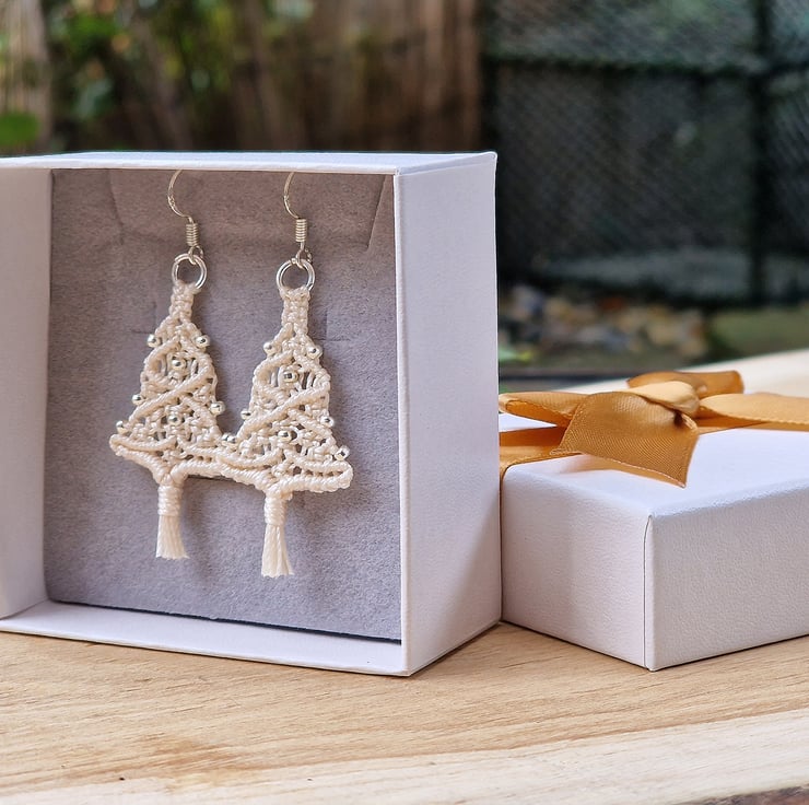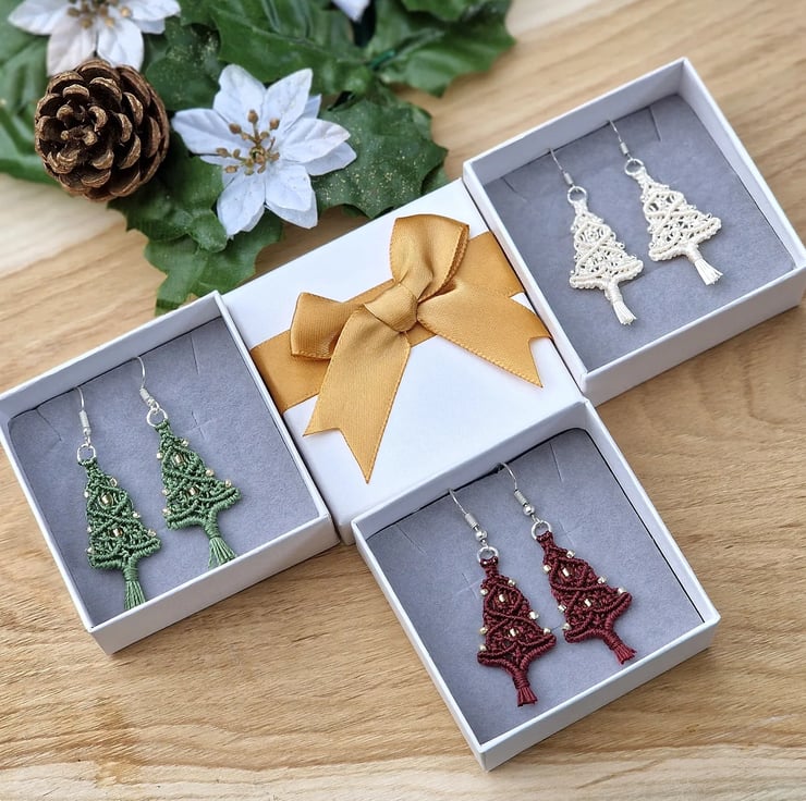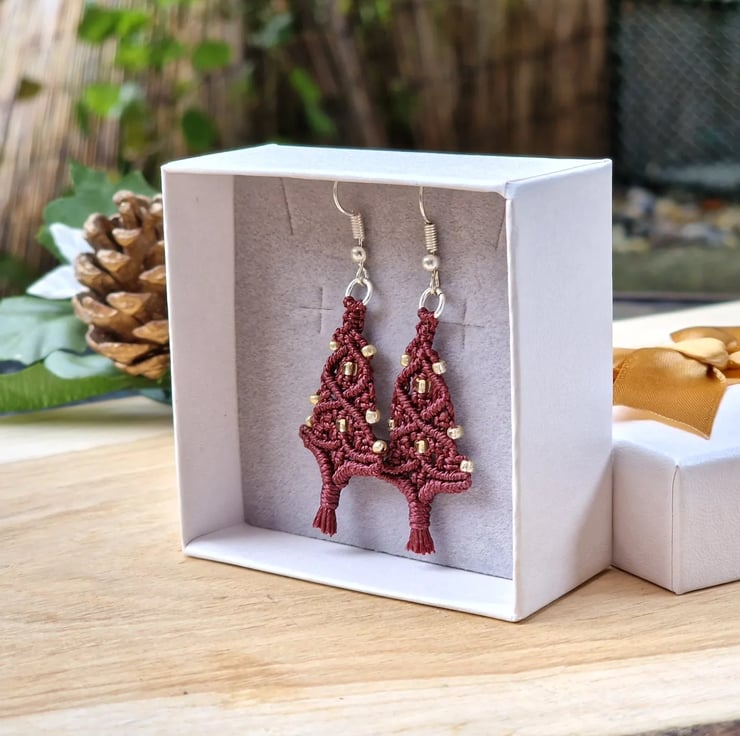 Add a touch of glimmer to your Christmas outfit with our unique handmade Macrame tree, Christmas novelty earrings. The boho earrings holds small seed beads to match rhe colour scheme ro replicate baubles.