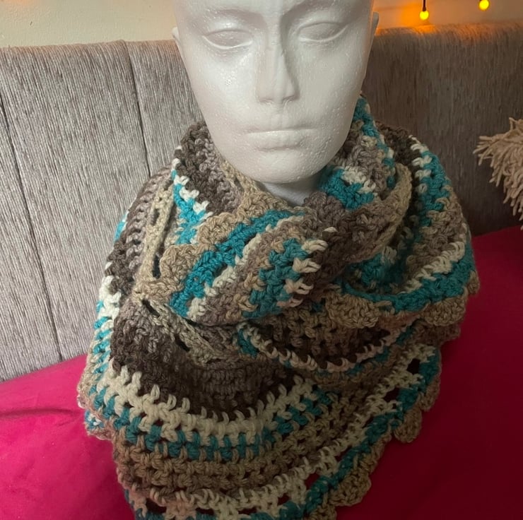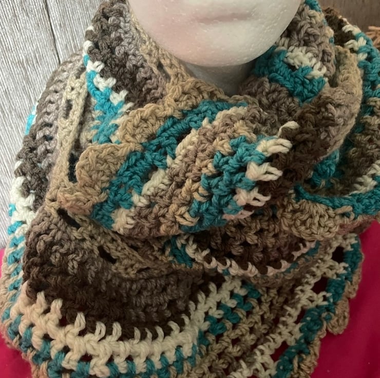Crocheted in cool colours, this Aran infinity scarf is an ideal way of keeping warm this winter.