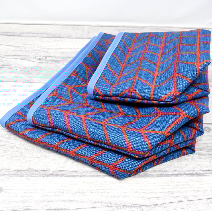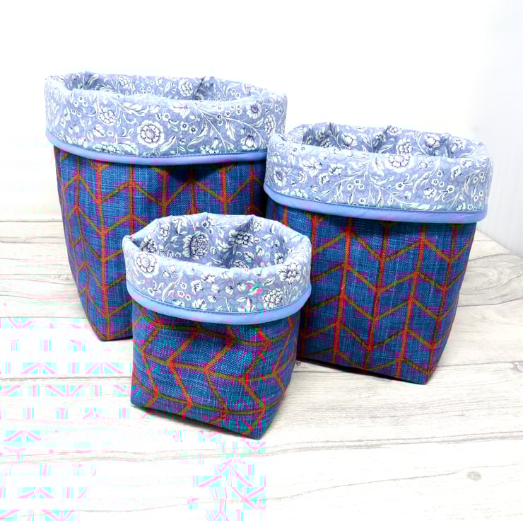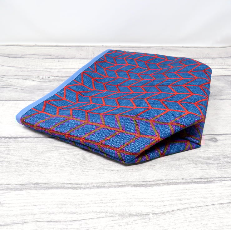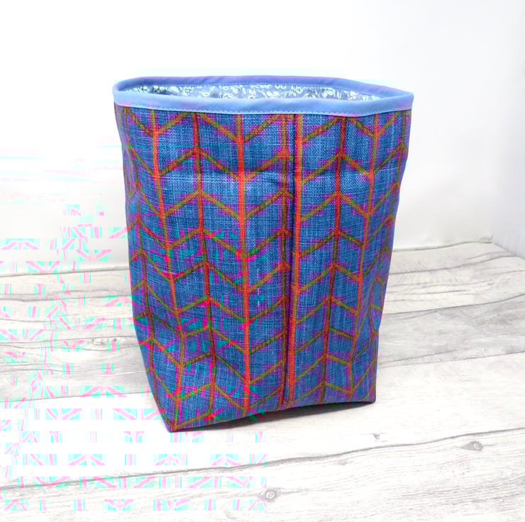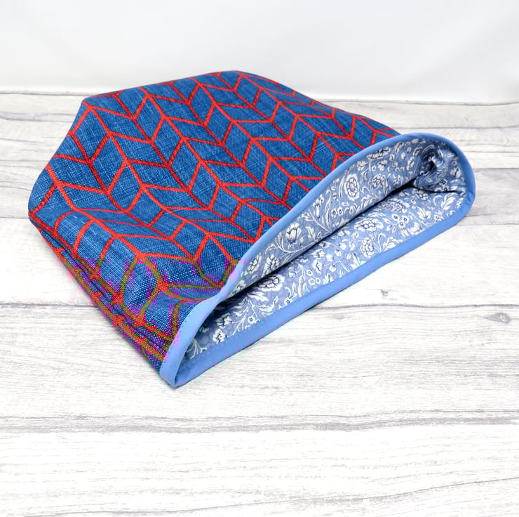 The red and blue geometric pattern of this large, reversible storage tub contrasts nicely with the blue floral lining and mid blue bias binding at the top edge. The bin has a layer of soft interlining for structure.