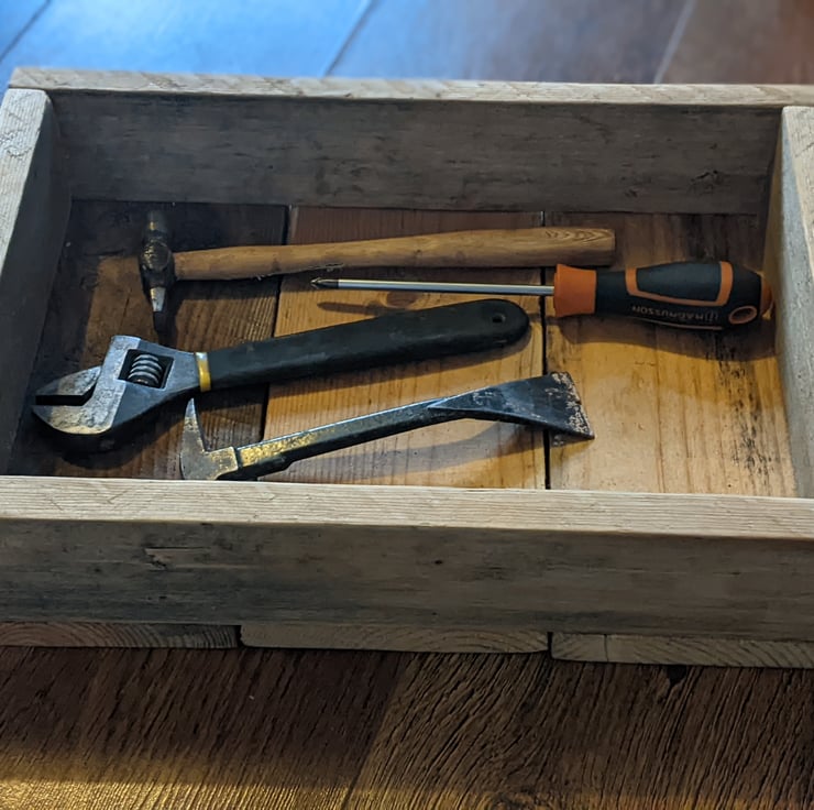 Wooden storage tray with black metal handles, made from reclaimed wood.