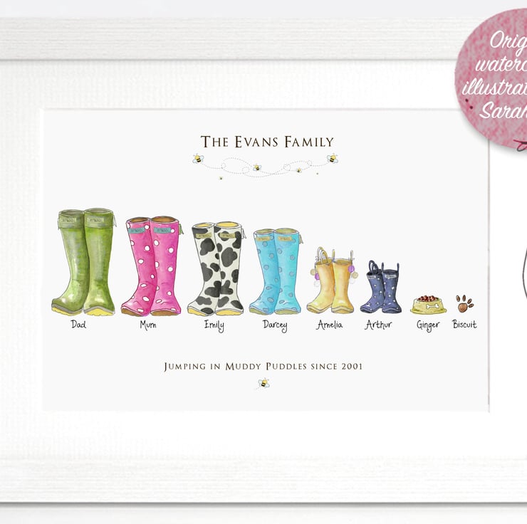 Represent your family with the Original Welly Boot Family & fancy feet prints, created by Sarah Law for Corkymandle in 2012, Our prints are high end quality, from our archival print process to our superior handmade frames. Each design represents your fun nature complimented beautifully with our painted watercolour illustrations. Each little boot has been lovingly painted and digitally reproduced to ensure you receive the highest quality original art print. We use colour matching software to ensure your print is exactly like the original paintings. Every framed print is gift wrapped for FREE in white tissue paper and beautifully presented. To read more about Corkymandle and Sarah please view the bio section.