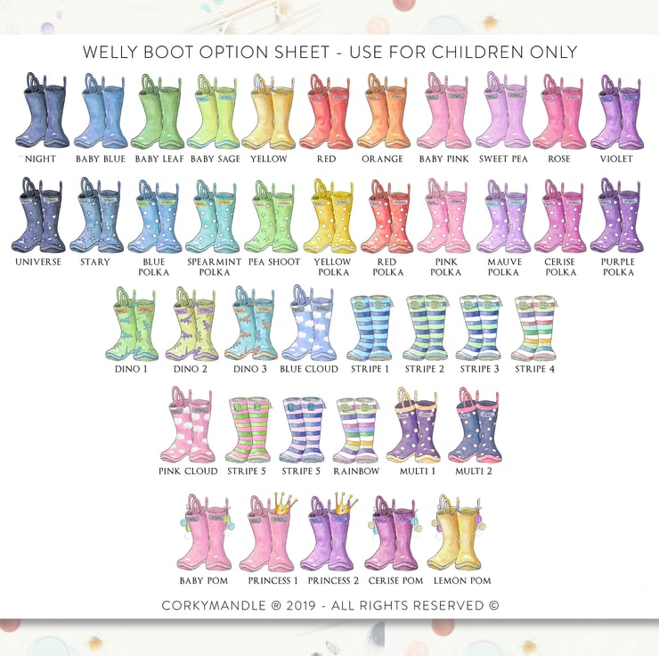 Represent your family with the Original Welly Boot Family & fancy feet prints, created by Sarah Law for Corkymandle in 2012, Our prints are high end quality, from our archival print process to our superior handmade frames. Each design represents your fun nature complimented beautifully with our painted watercolour illustrations. Each little boot has been lovingly painted and digitally reproduced to ensure you receive the highest quality original art print. We use colour matching software to ensure your print is exactly like the original paintings. Every framed print is gift wrapped for FREE in white tissue paper and beautifully presented. To read more about Corkymandle and Sarah please view the bio section.