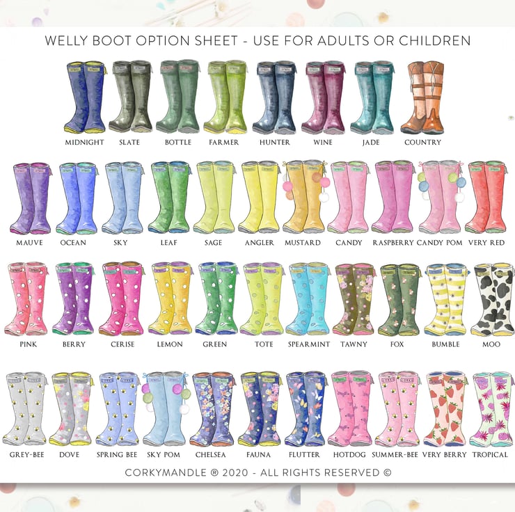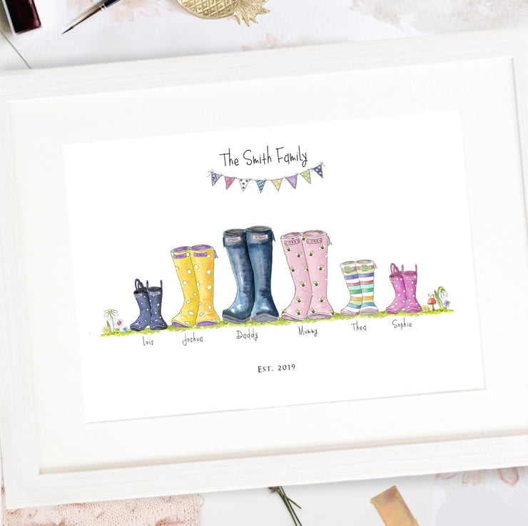 Represent your family with the Original Welly Boot Family & fancy feet prints, created by Sarah Law for Corkymandle in 2012, Our prints are high end quality, from our archival print process to our superior handmade frames. Each design represents your fun nature complimented beautifully with our painted watercolour illustrations. Each little boot has been lovingly painted and digitally reproduced to ensure you receive the highest quality original art print. We use colour matching software to ensure your print is exactly like the original paintings. Every framed print is gift wrapped for FREE in white tissue paper and beautifully presented. To read more about Corkymandle and Sarah please view the bio section.
