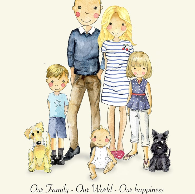 Line up Line up! all your family including the pets beautifully painted and framed. We can accommodate for most most family variations to create your unique personalised family print. This would make a wonderful Mothers Day gift, new baby gift or a
