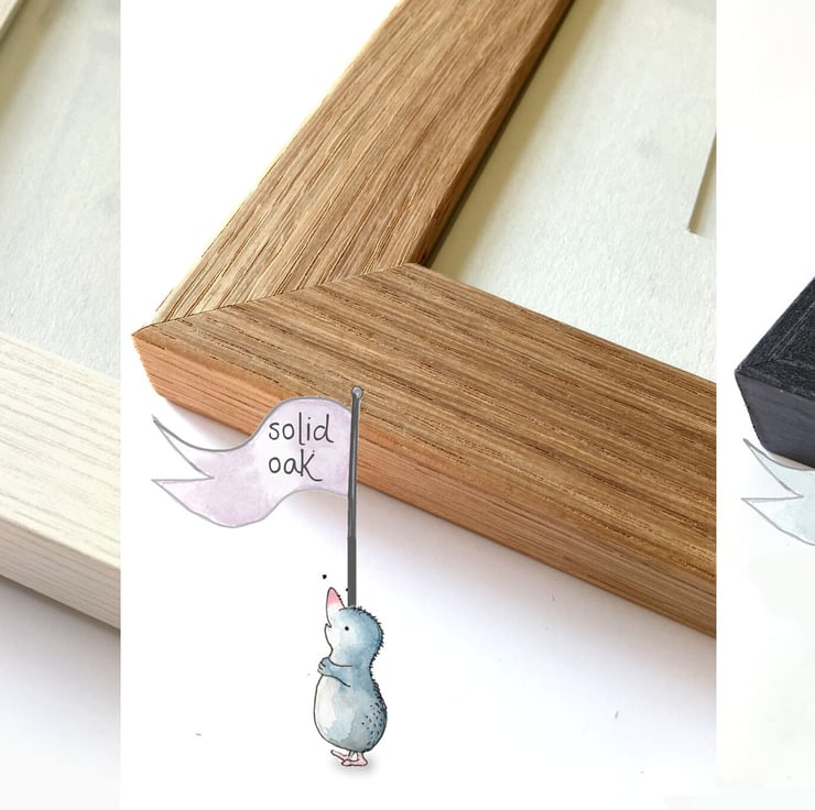 Framed by hand in white, black or solid oak