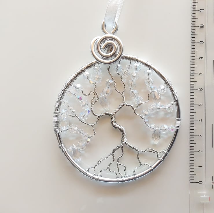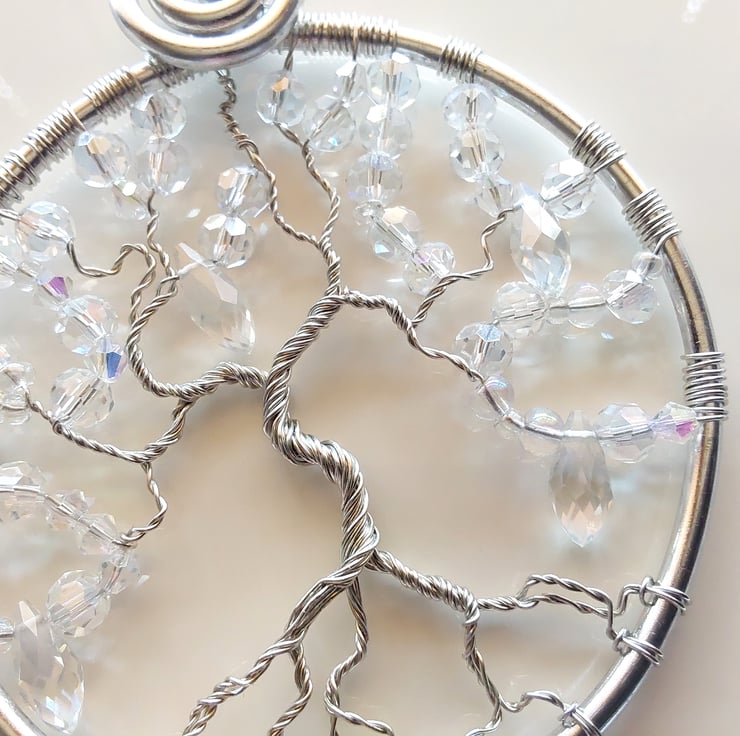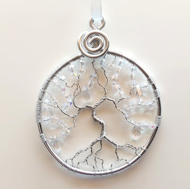 The tree is made from silver plated copper wire and crystal clear glass faceted beads with a rainbow coating in different shapes and sizes to add an ice effect. It also has a white ribbon so it is ready to hang. There is only one available so when it's gone it's gone.