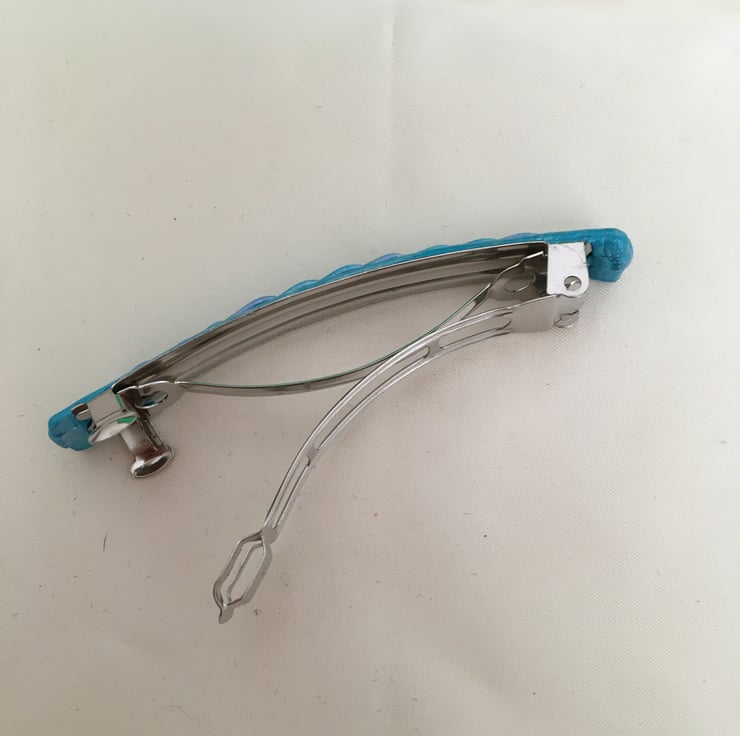 The hair slide is created using polymer clay, the clay is hand rolled and fitted to the metal top of the slide to form the base before the patterning is added. The design is formed by finely hand-rolling the clay and placing into the desired pattern position. When the design is complete specialist powders are added to enhance the colour tones before firing, this gives a lovely soft satin sheen finish.
