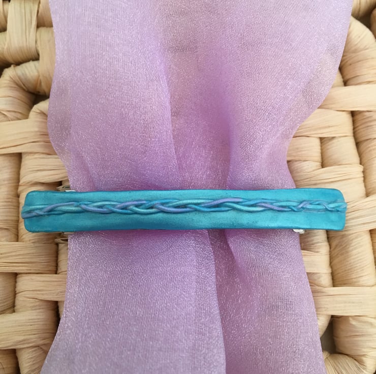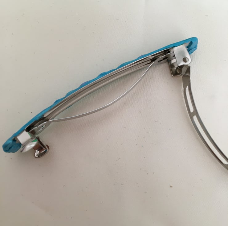 The hair slide is created using polymer clay, the clay is hand rolled and fitted to the metal top of the slide to form the base before the patterning is added. The design is formed by finely hand-rolling the clay and placing into the desired pattern position. When the design is complete specialist powders are added to enhance the colour tones before firing, this gives a lovely soft satin sheen finish.