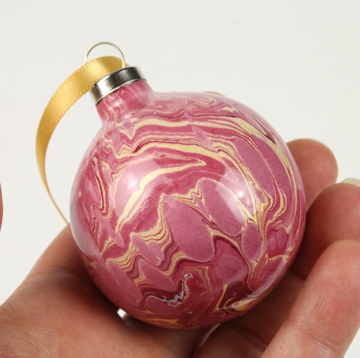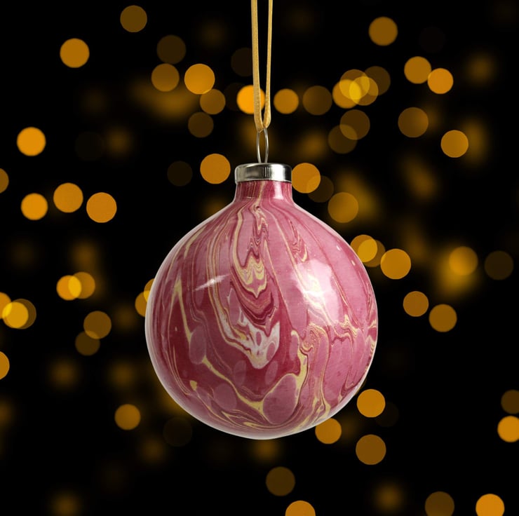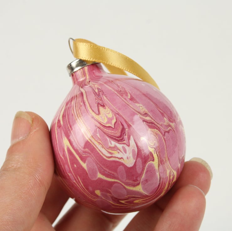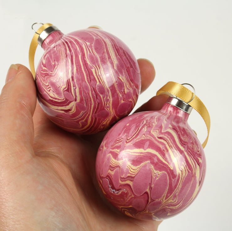 The baubles in this range are marbled directly onto the ceramic surface - a technique which is much more difficult than it sounds! Each bauble is marbled from a different bath, so they are all different and totally unique. They are lots of fun to make and totally addictive!