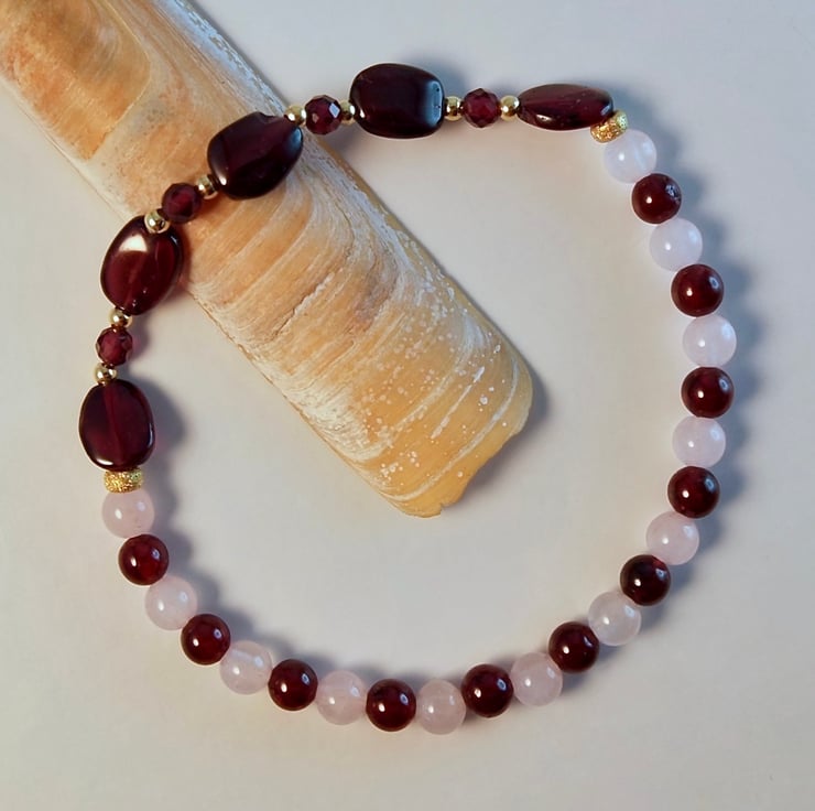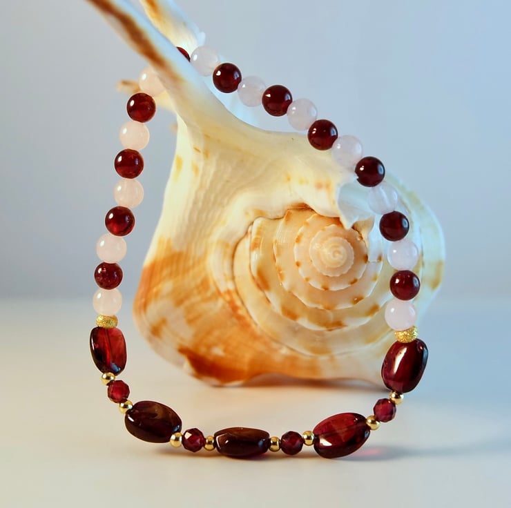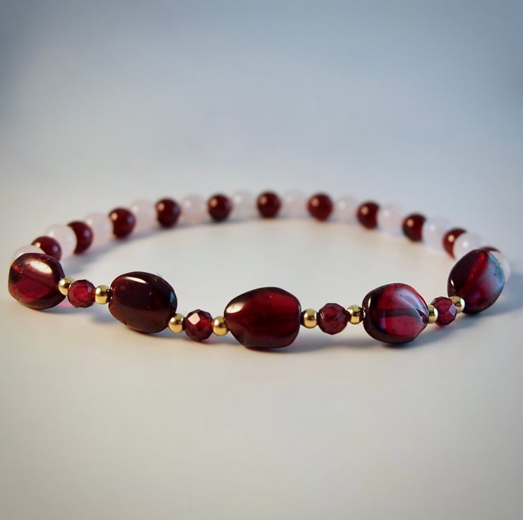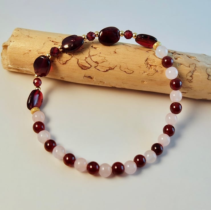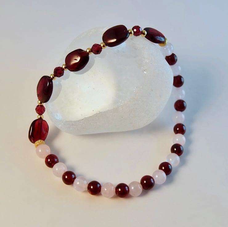 The circle is completed with alternating 4mm Garnet and Rose Quartz rounds.