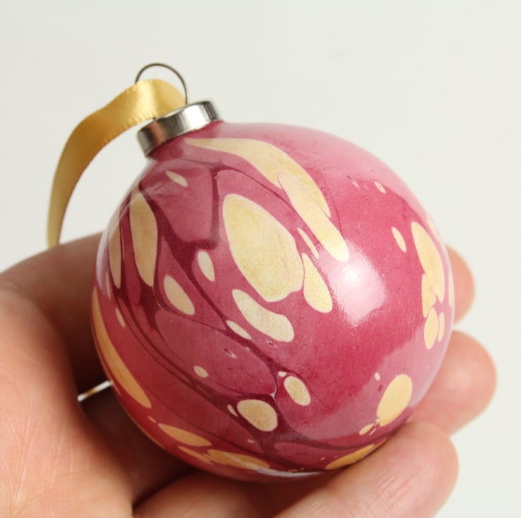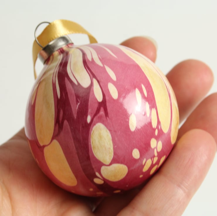 The baubles in this range are marbled directly onto the ceramic surface - a technique which is much more difficult than it sounds! Each bauble is marbled from a different bath, so they are all different and totally unique. They are lots of fun to make and totally addictive!