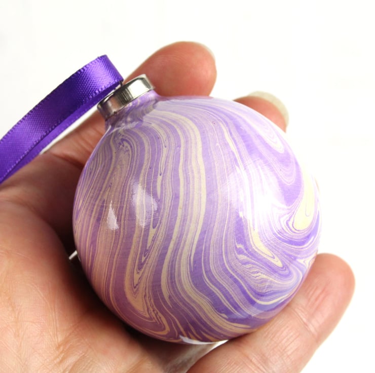 Hand marbled ceramic Christmas bauble in a swirly purple and gold agate style pattern.