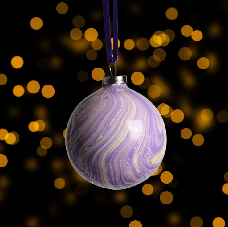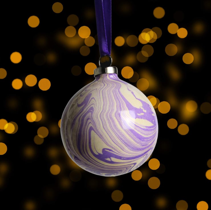 Hand marbled ceramic Christmas bauble in a swirly purple and gold agate style pattern.