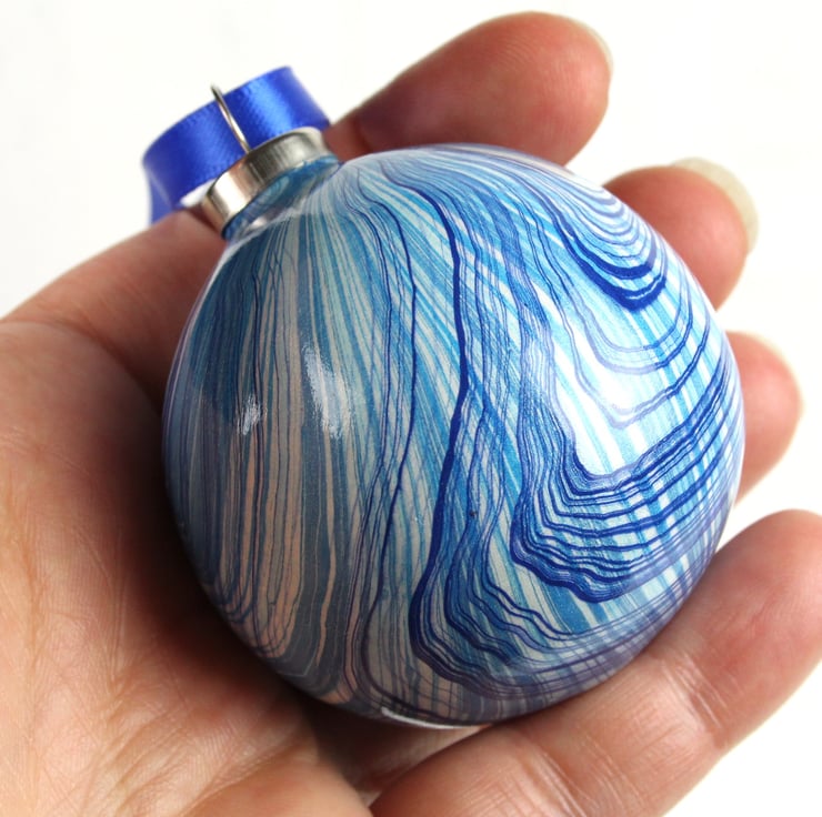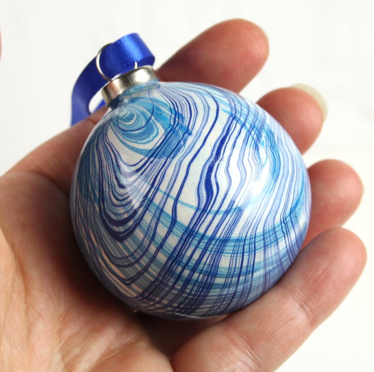 Hand marbled ceramic Christmas bauble in two layers of swirly blue, turquoise and white stripes.