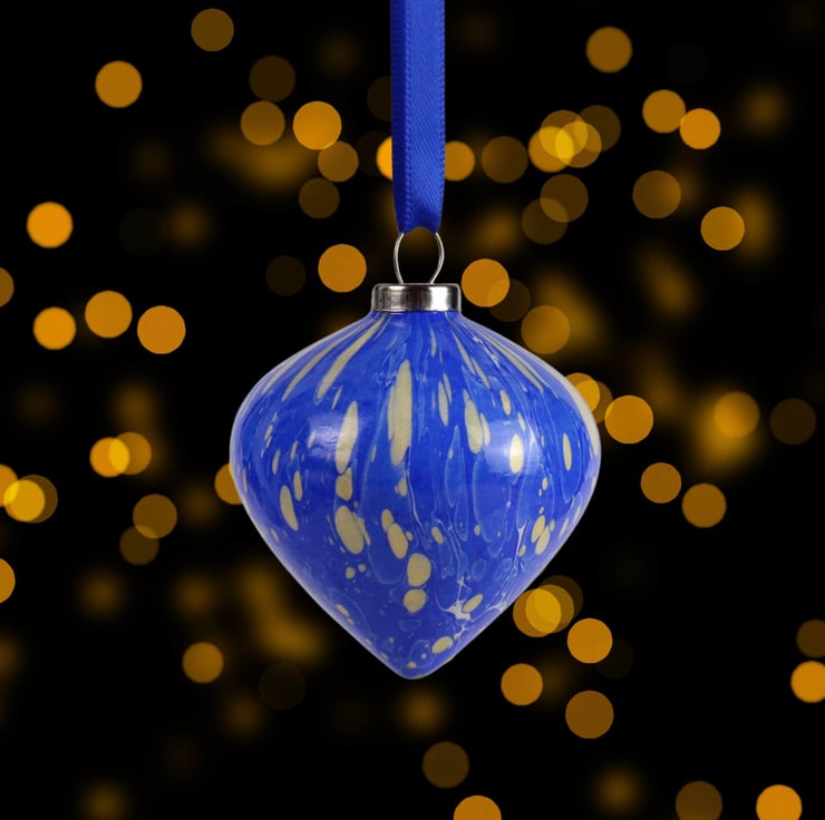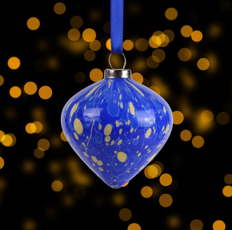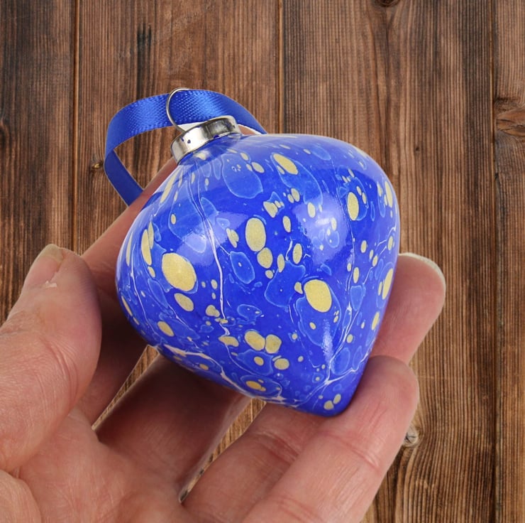 Rich blue with gold spots adorns this pretty festive hand marbled ceramic drop bauble.