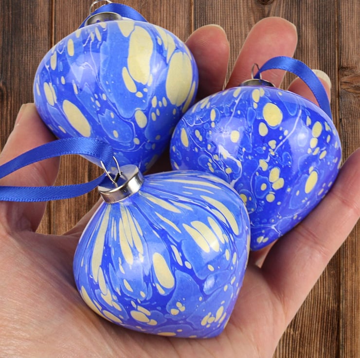 The baubles in this range are marbled directly onto the ceramic surface - a technique which is much more difficult than it sounds! Each bauble is marbled from a different bath, so they are all different and totally unique. They are lots of fun to make and totally addictive!