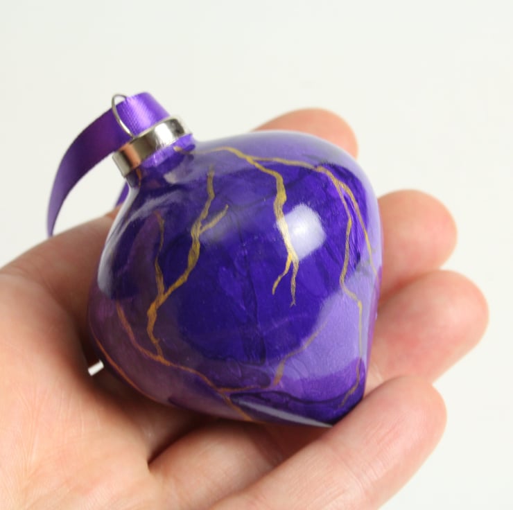 A pretty purple hand marbled ceramic Christmas bauble with hand painted gold veins. One for the purple lover!