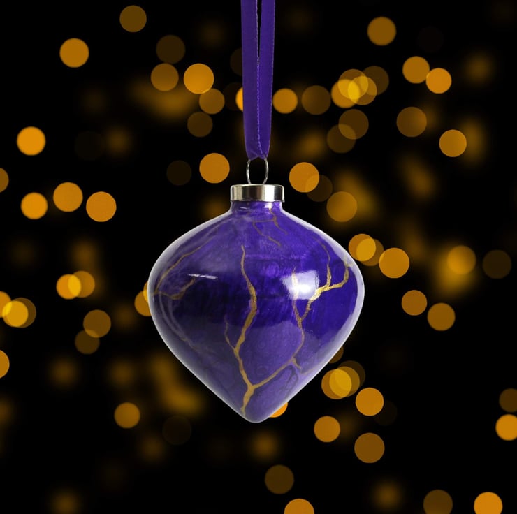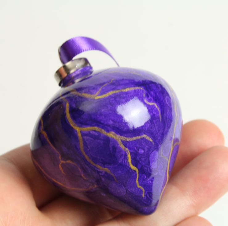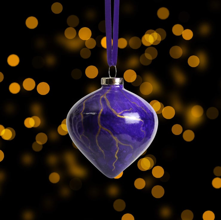 Ceramic Christmas bauble purple and gold vein drop shape hand marbled