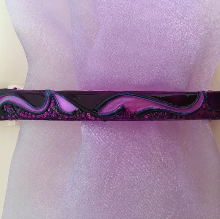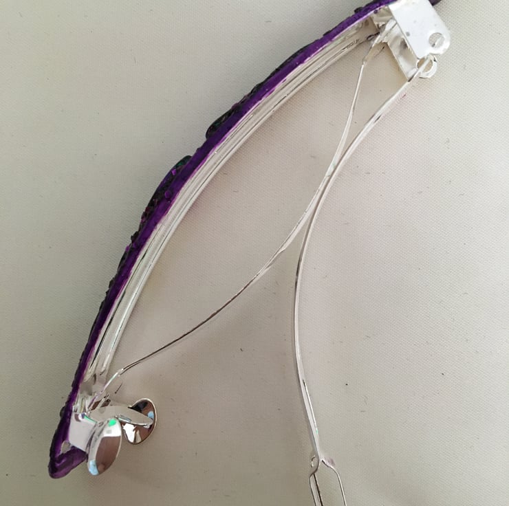 The hair slide is created using a polymer clay base, the design is freehand and is formed by finely hand-rolling the clay and placing in position. The colours are then added and are a combination of glass paints mixed with fine glitter, specialist powders and polymer paints. This would look great with a colour co-ordinated evening wear outfit.