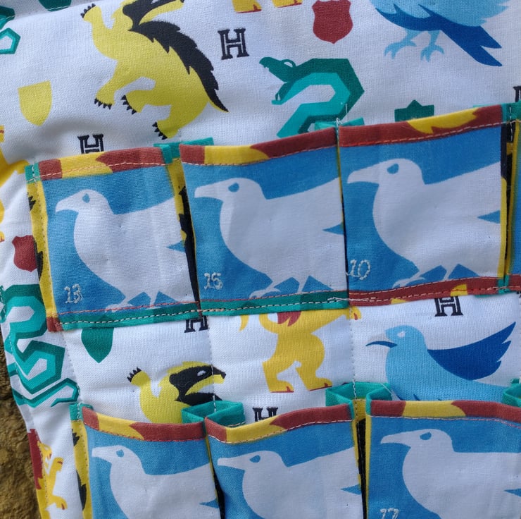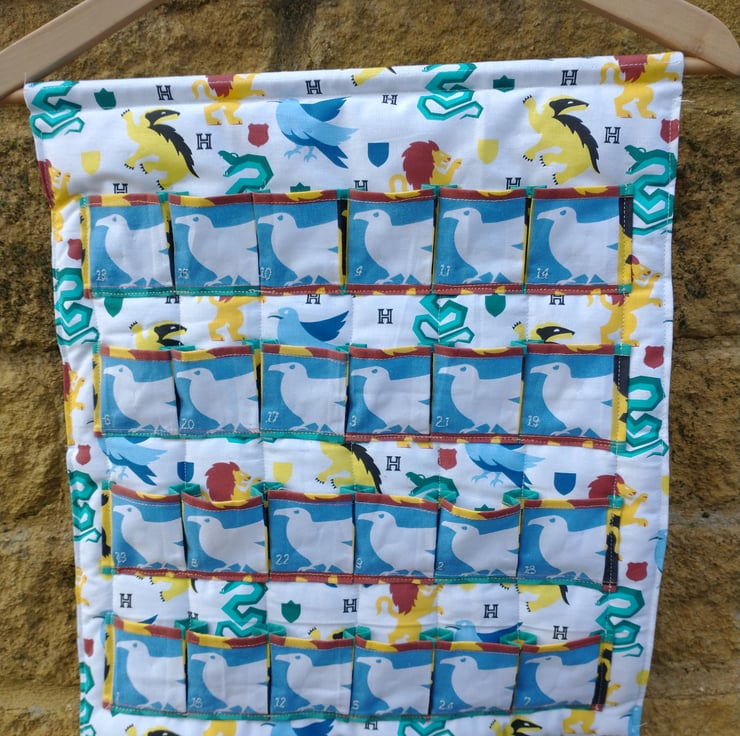 This reusable advent calendar is made with Harry Potter Ravenclaw themed fabric. It has been designed and sewn here at my small studio in the Cotswolds.