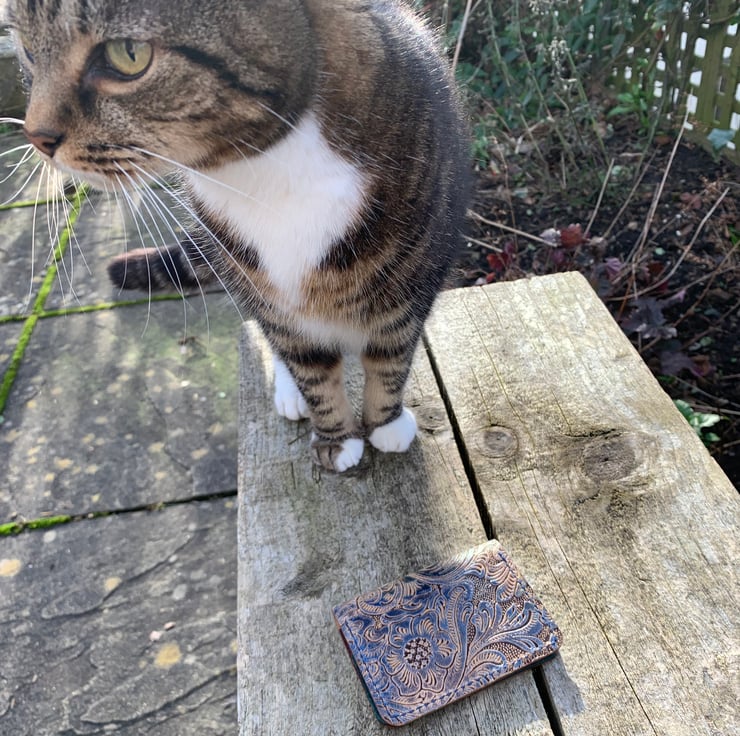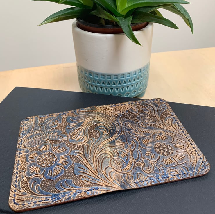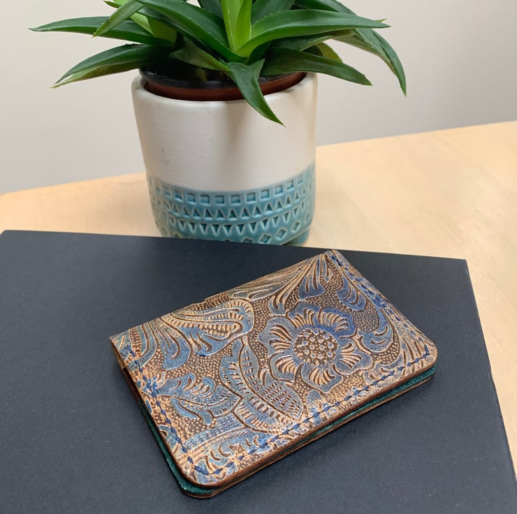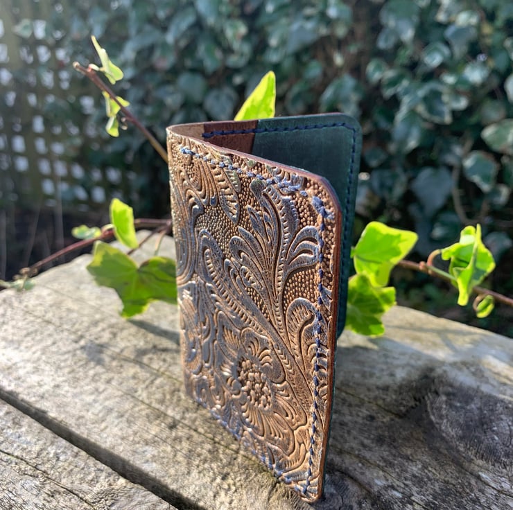 The Wooster wallet is made with fine, light leather from a tannery here in England. The exterior features embossed leather in blue, green and browns with a pearlescent finish, the interior features 2 pockets made with teal leather and 2 pockets made with brown leather. Stitched with Ritza tiger waxed thread in navy.
