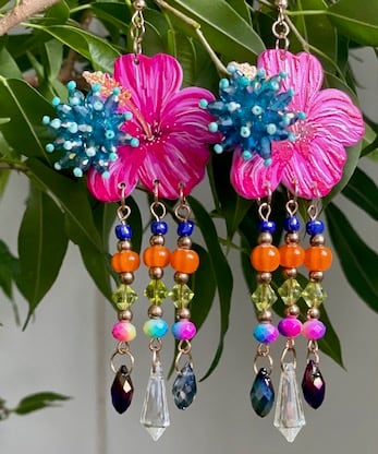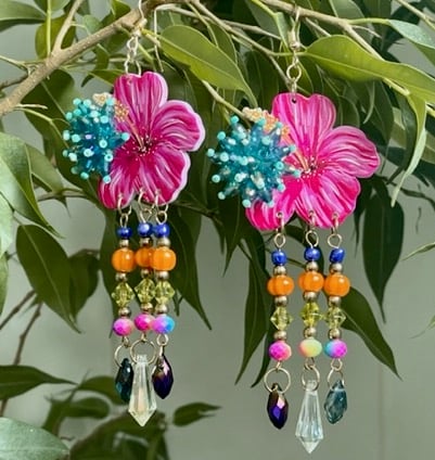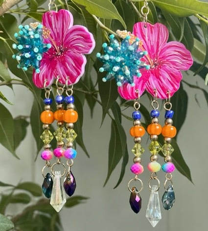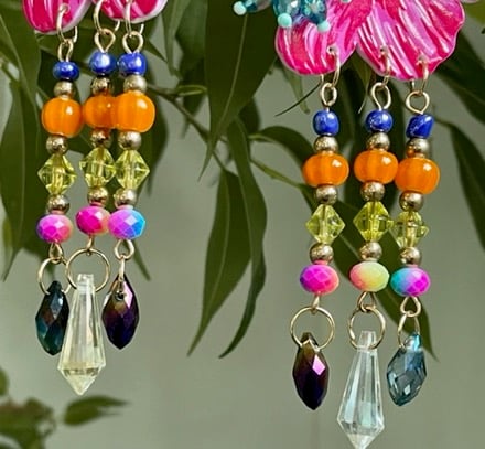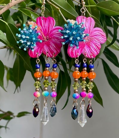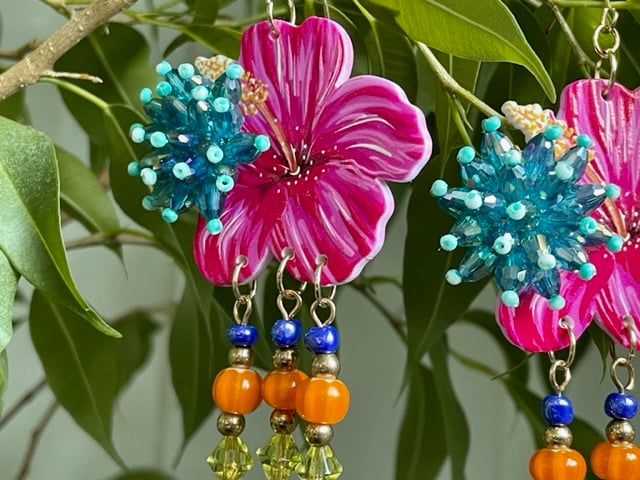 I've used gorgeous painted resin hibiscus flowers and paired them with stunning blue beaded clusters. I've got all fringy and hung blue glass beads, orange pumpkin beads, green bicones and rainbow crystals. I've finished off with gorgeous fire polished drops in purple and blue and a stonker of a clear crystal with a touch of Aurora Borealis! All these are complimented with little gold balls and gold plated hypo allergenic ear wires. I know. Why go small?