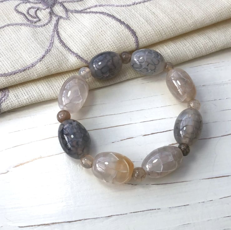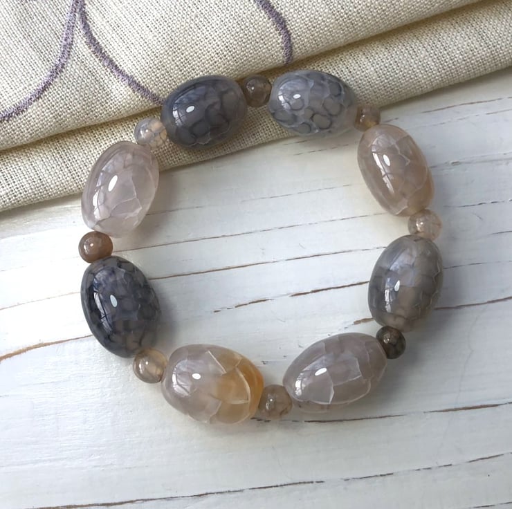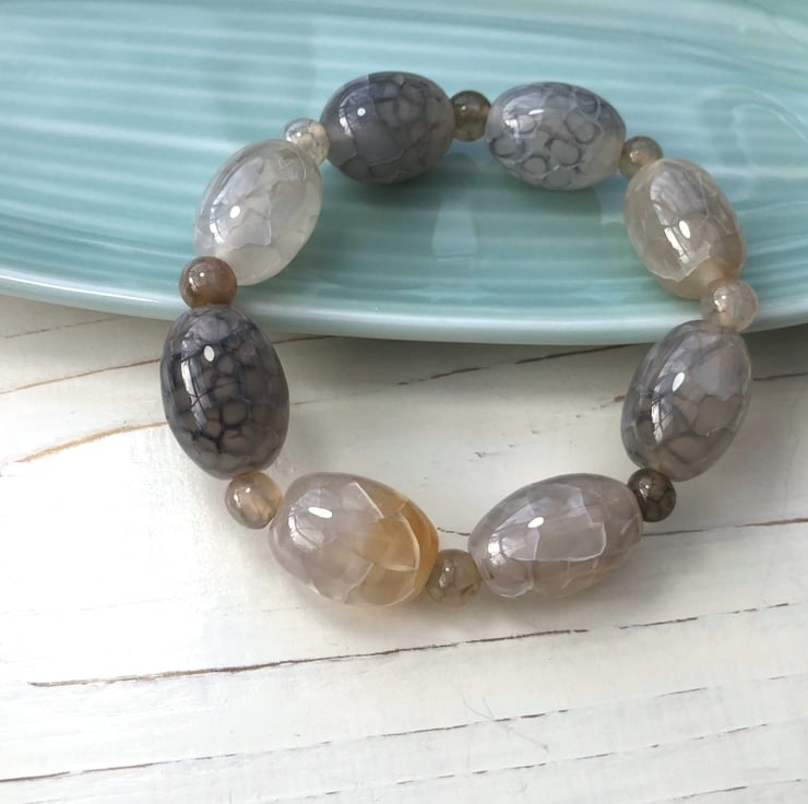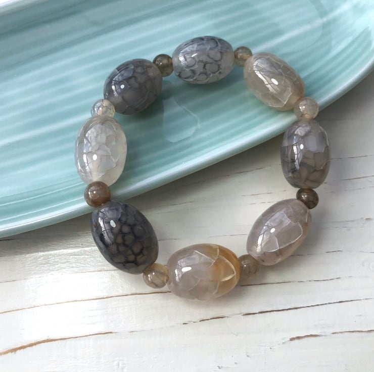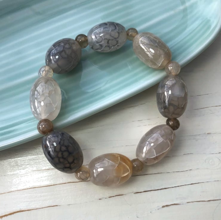 Lovely web agate beaded bracelet. Elasticated and very comfortable to wear. The colours of the beads are quite pale, probably a little paler than your screen shows, this makes the bracelet look quite delicate. I've found it quite difficult to capture the actual colour, I thought the beads were going to be darker when I ordered them but they turned out to be a lot paler than I expected, even so I don't think you would be disappointed in them.