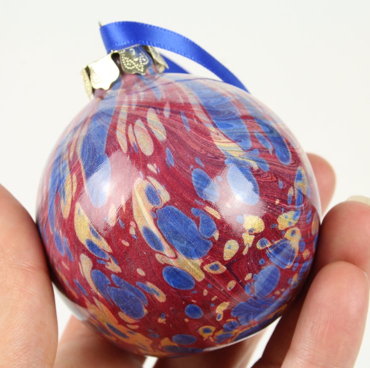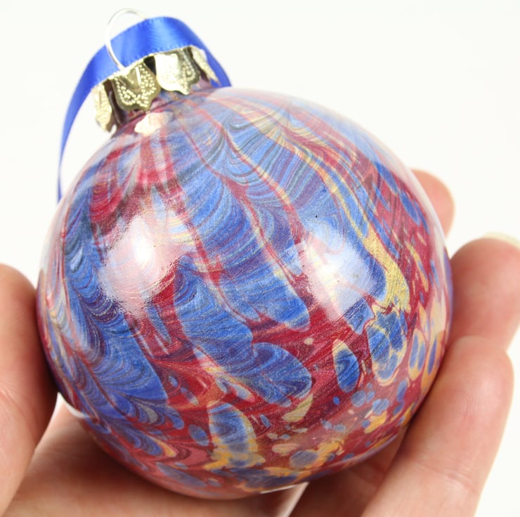 The baubles in this range are marbled directly onto the ceramic surface - a technique which is much more difficult than it sounds! Each bauble is marbled from a different bath, so they are all different and totally unique. They are lots of fun to make and totally addictive!