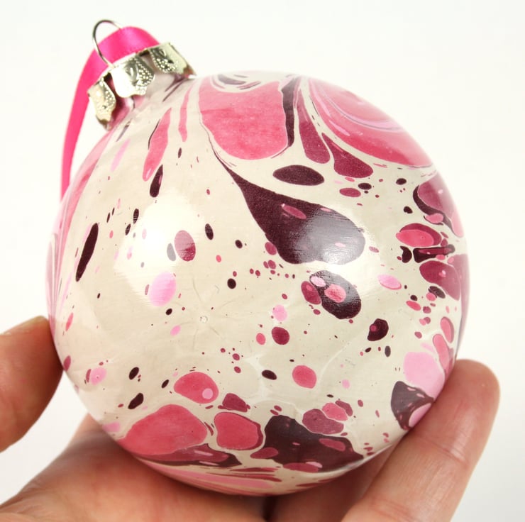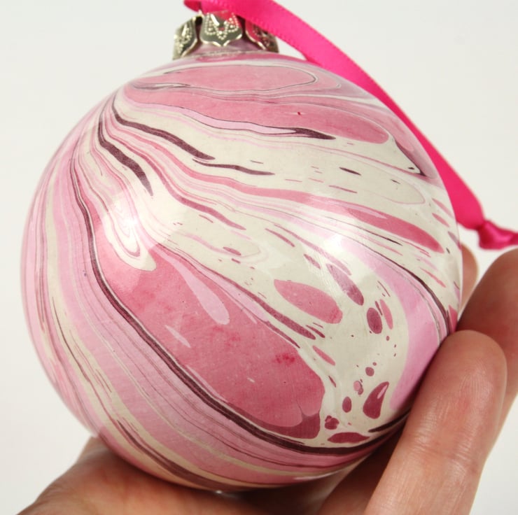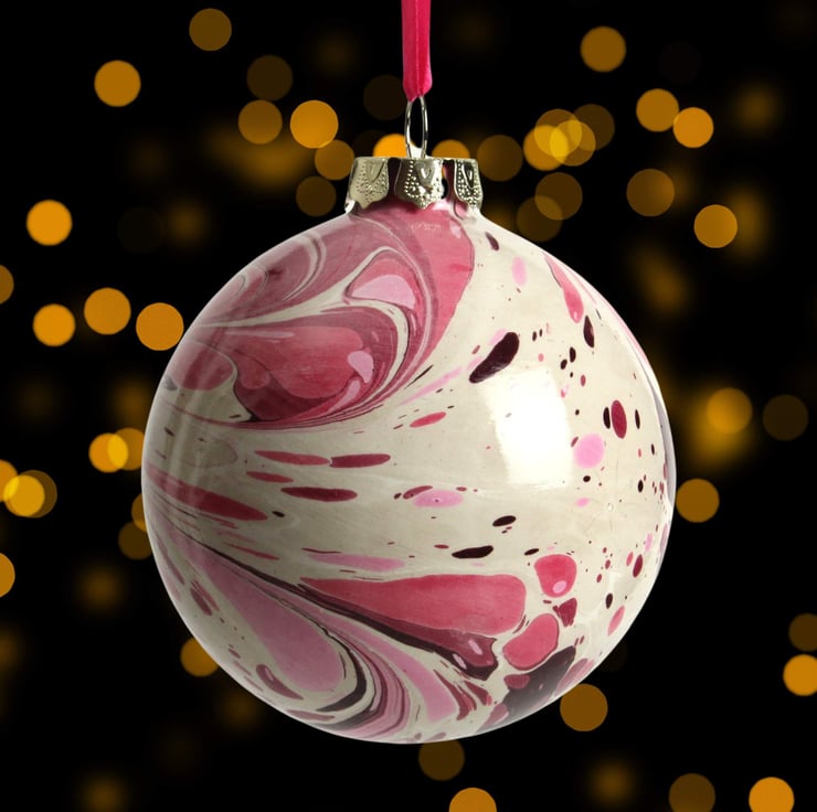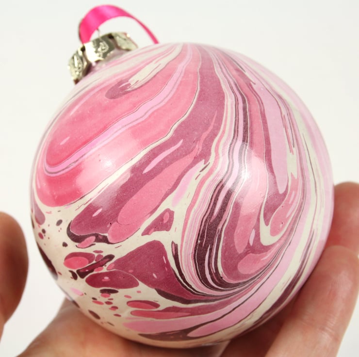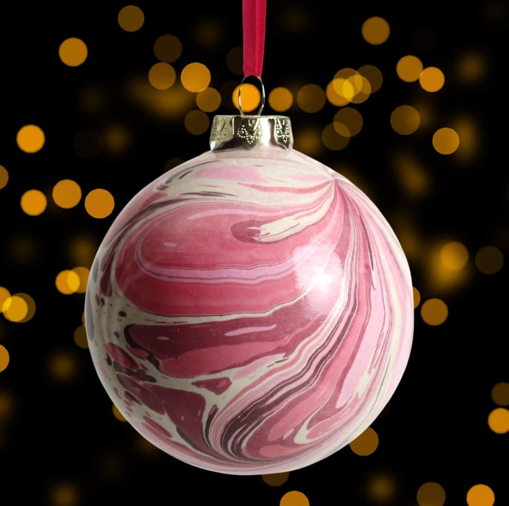 Large hand marbled ceramic Christmas decoration bauble pink red
