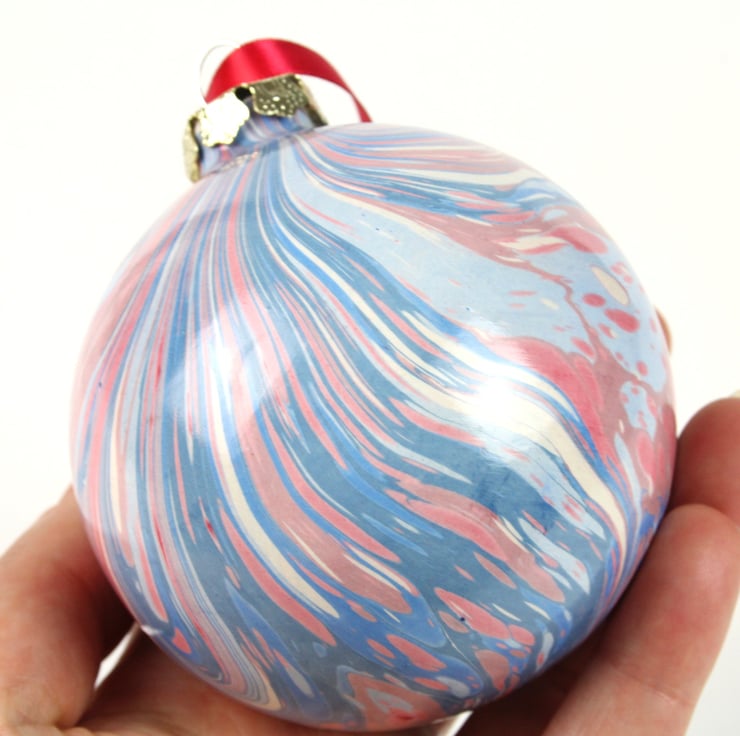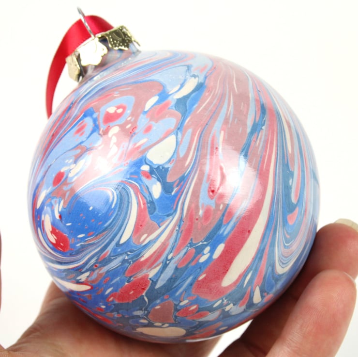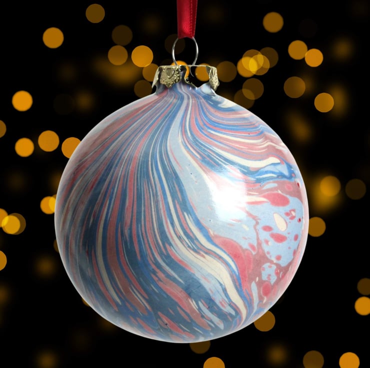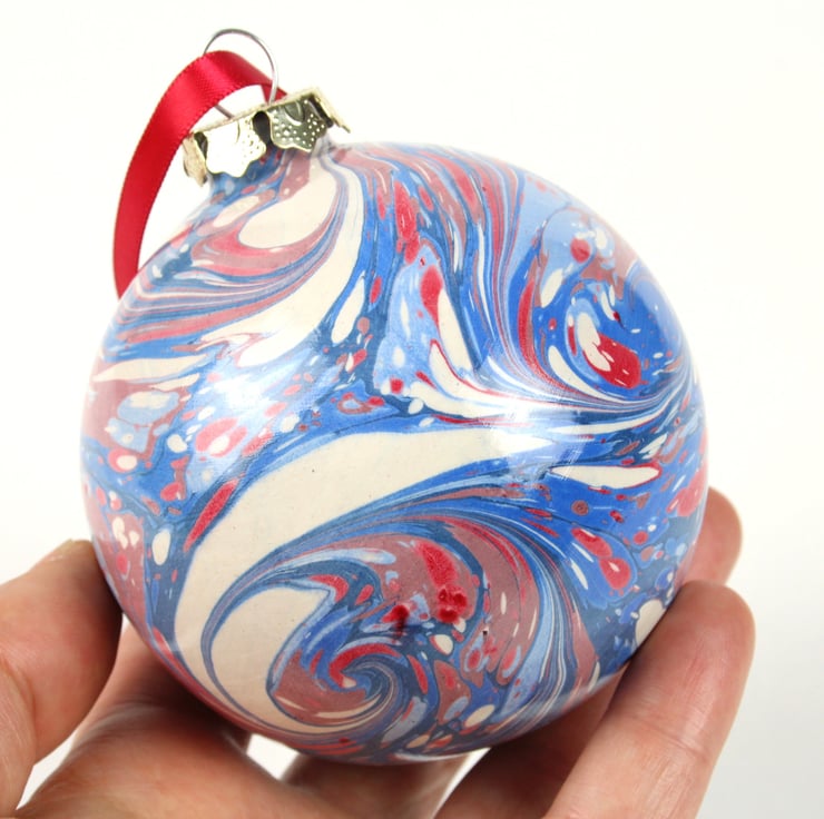 A gorgeous luxury marbled ceramic bauble in a swirling blue, red and cream palette.