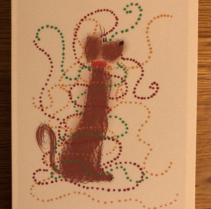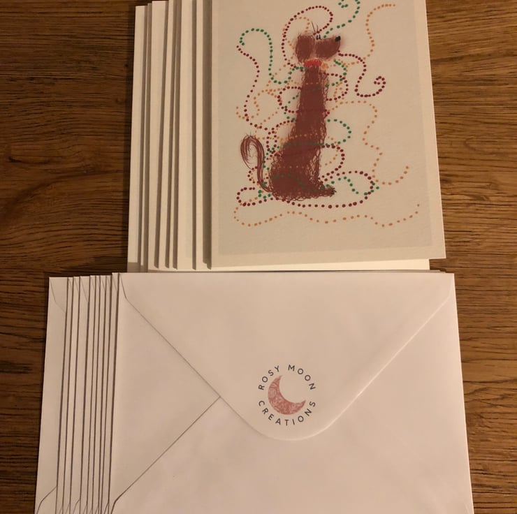 Hand drawn cards with an adorable pup wrapped up in Christmas lights. The cards measure approximately 17x24cm and come with matching envelopes.