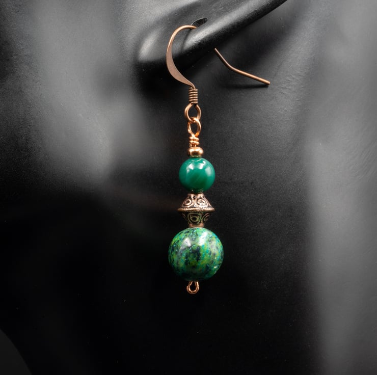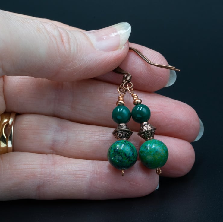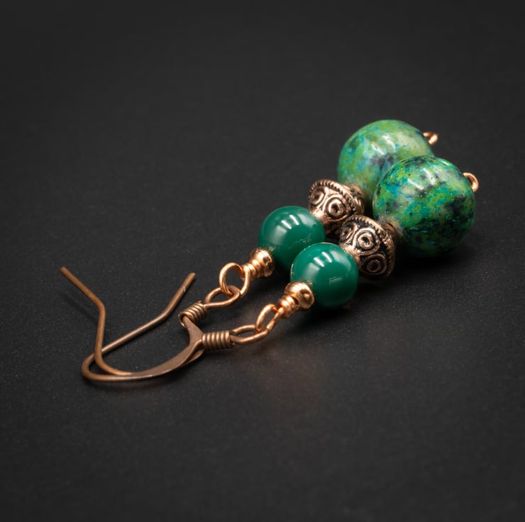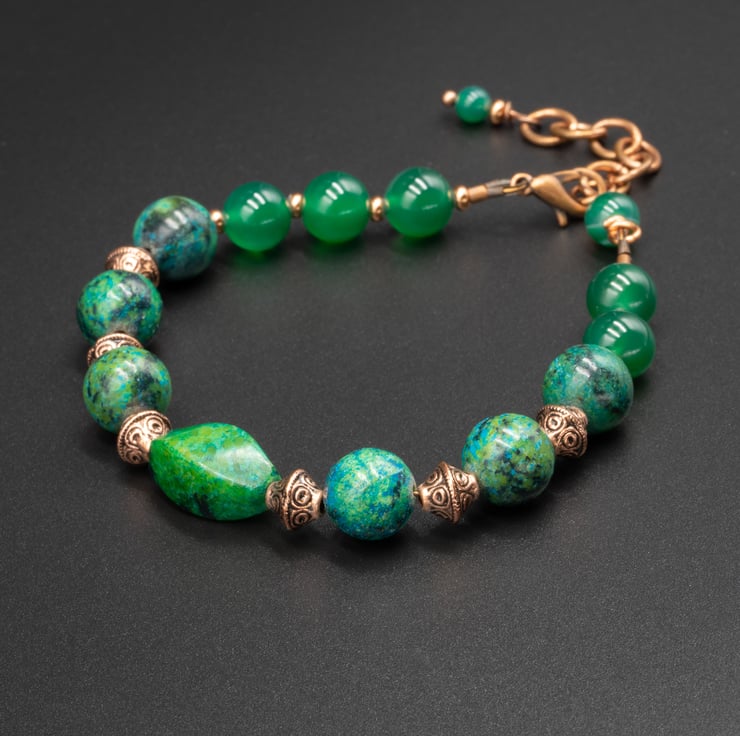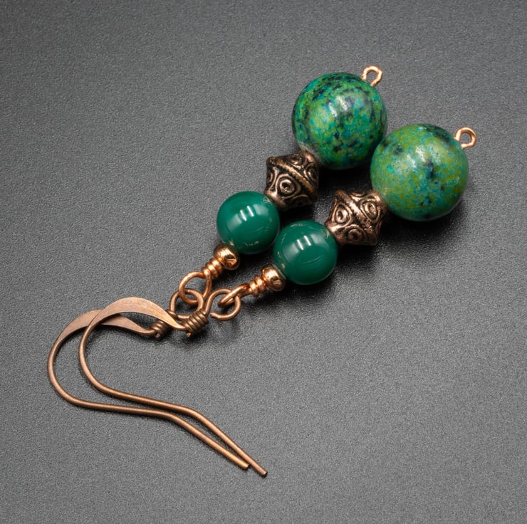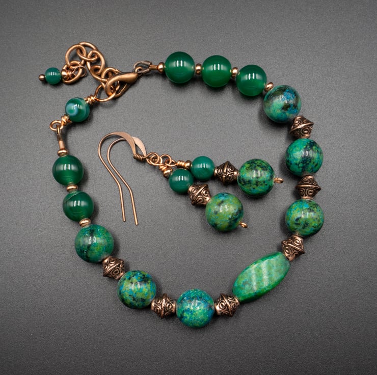 Beads - 10mm rounds and a 15 x 8mm barrel of chrysocolla are matched with 8mm round green agate and copper plated accent beads.