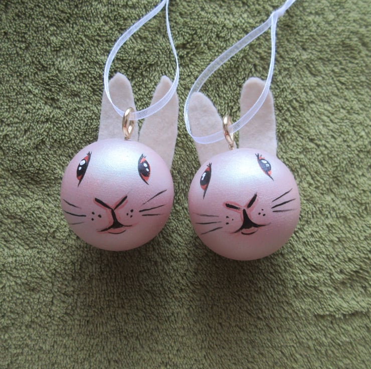 A pair of hand painted wooden baubles, painted to look like rabbits.