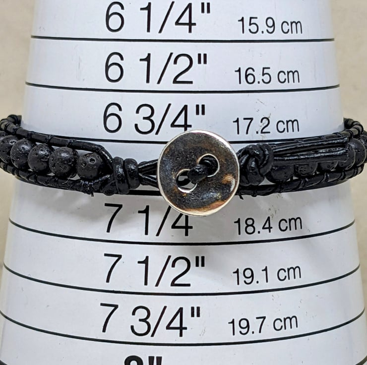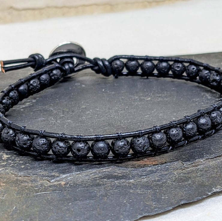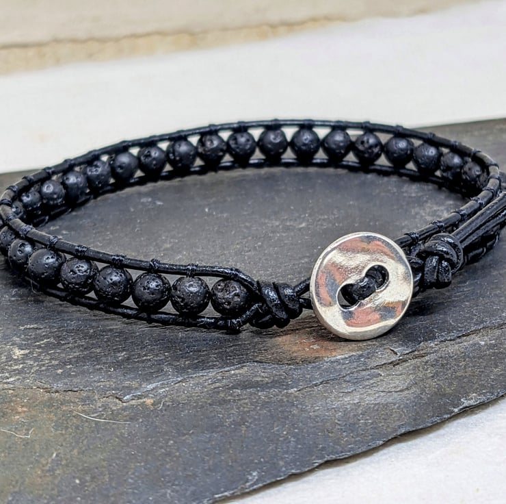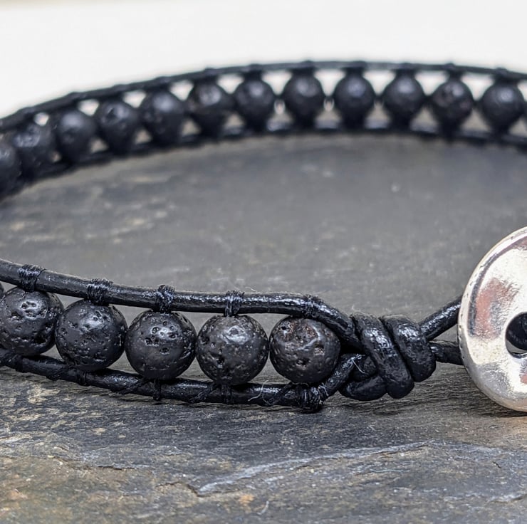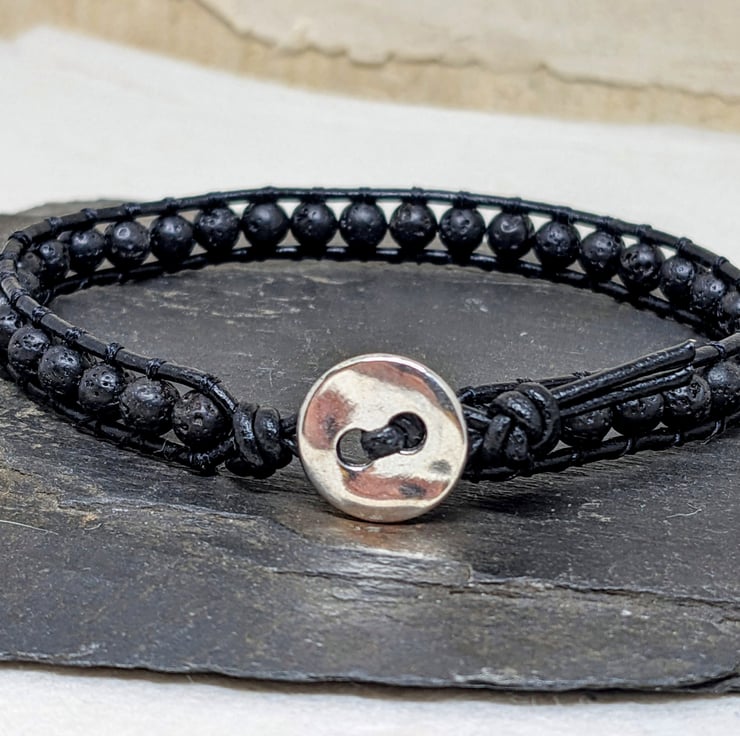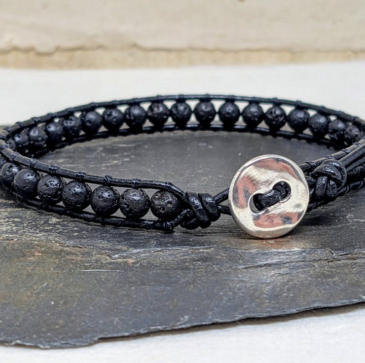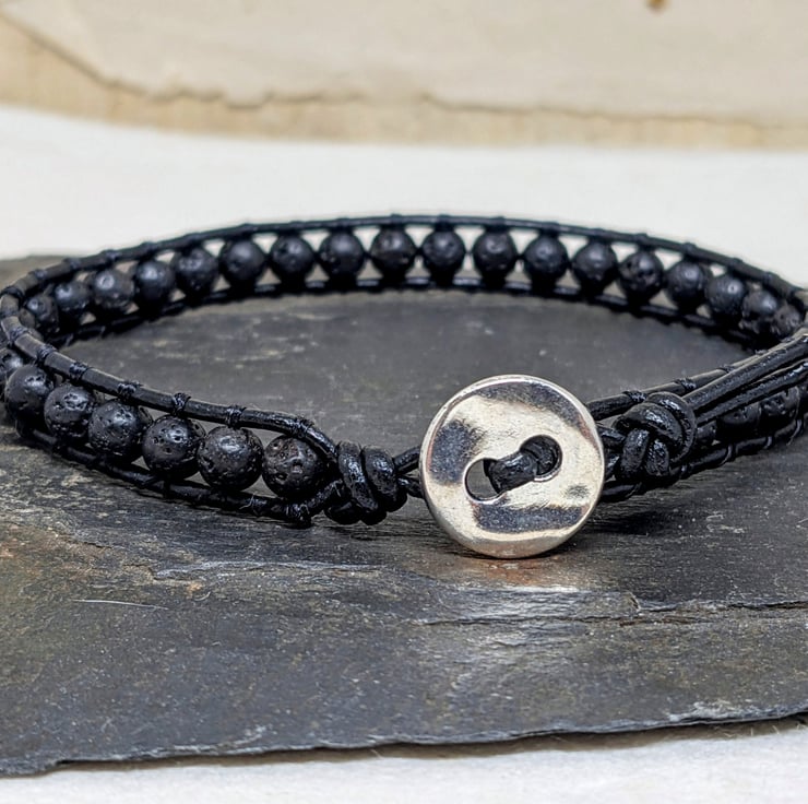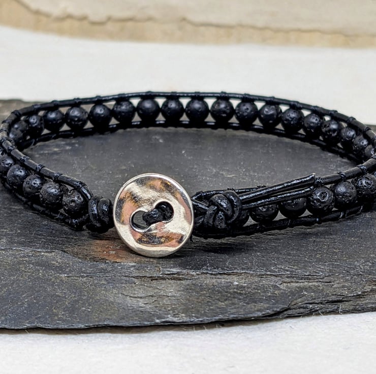This beautifully simple bracelet has been made with rugged black lava beads. They've been attached to genuine black leather cord and a silver coloured button has been used as a fastener.