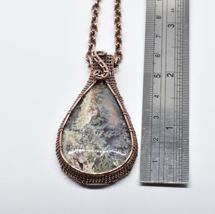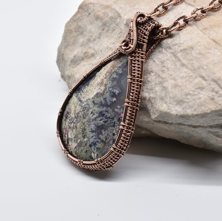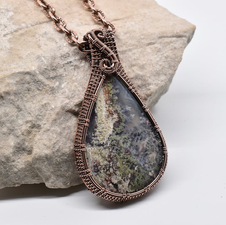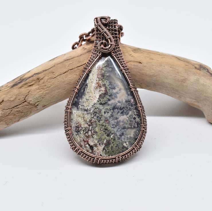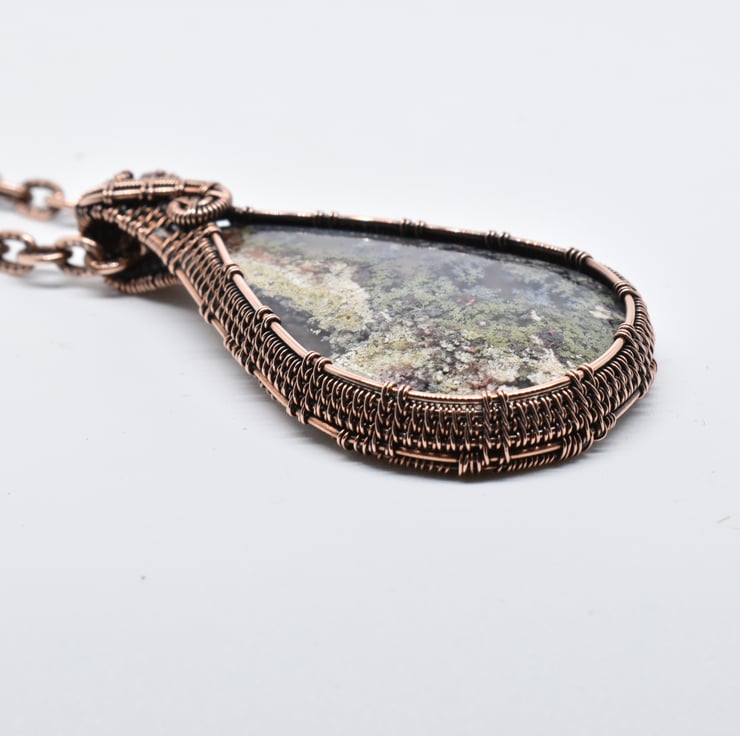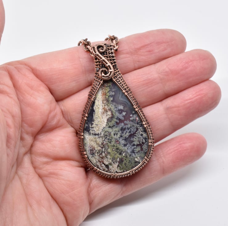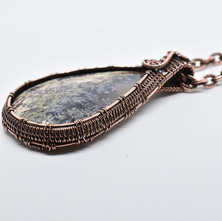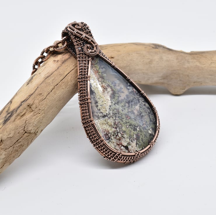 This beautiful Indonesian moss agate is set in a hand woven solid copper wire setting to make this striking unisex pendant.
