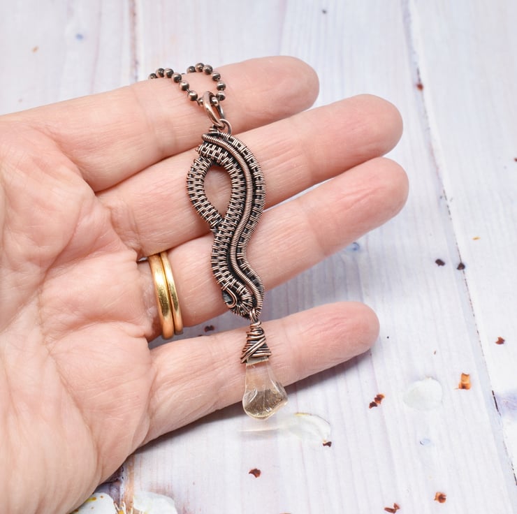 A steampunk gothic style copper pendant hand woven using solid copper wire with an organic shaped citrine teardrop hanging from the bottom.