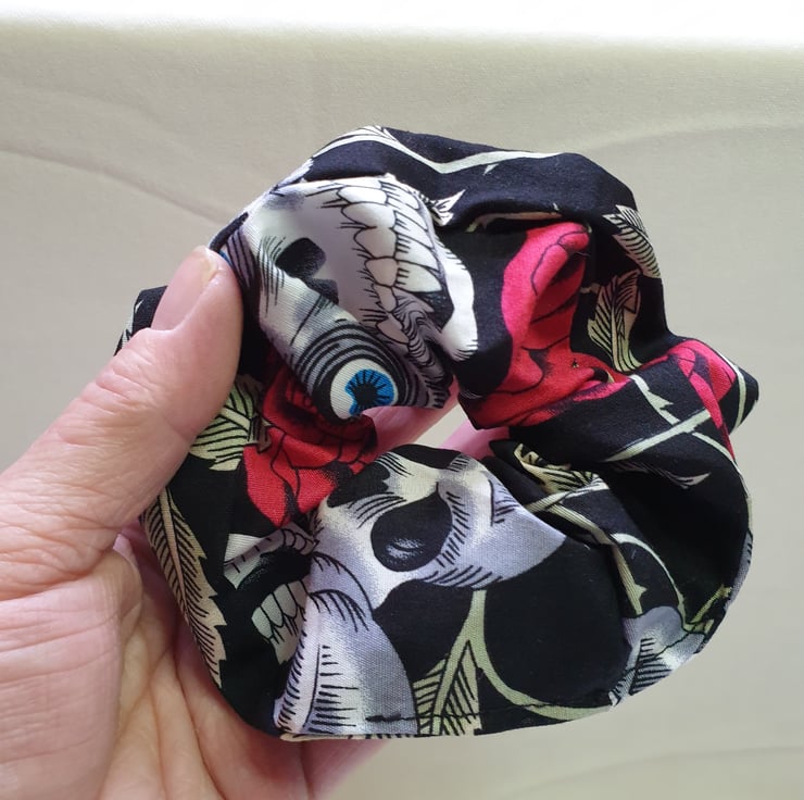 Fabric 2 is black, white and red with skulls and roses all over it.