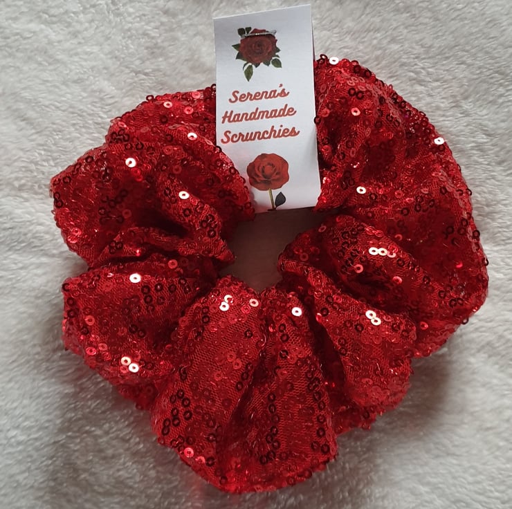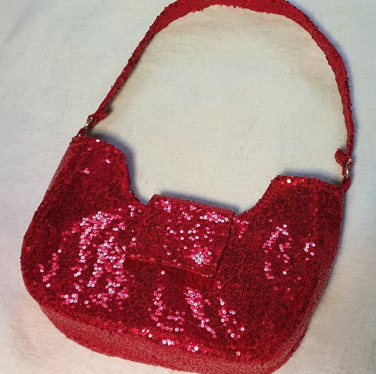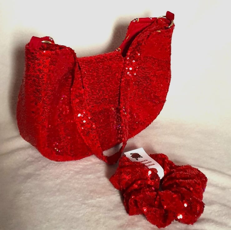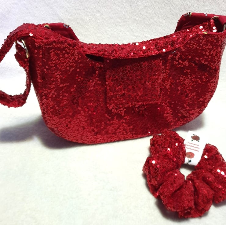 Red sequin shoulder bag lined in red cotton poplin with small flowers (as shown in photo), comes with a red sequin hair scrunchie to match.